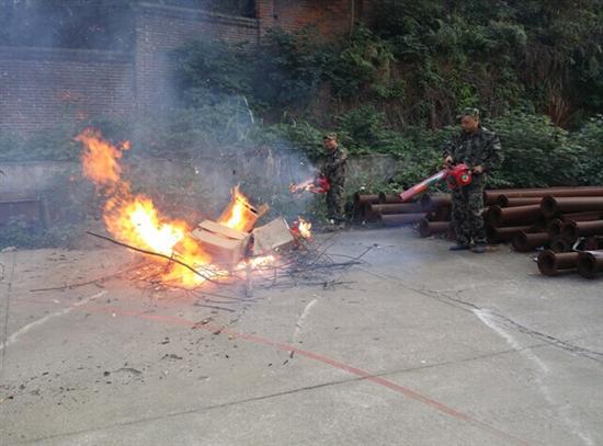 此次演练模拟了九狮村童子坡发生森林火灾,由乡政府、林业站组织成立演练指挥部,由乡党委书记颜伏招任政委,乡长林辉任现场演练总指挥。一声哨响,全体扑火队员紧急集结动员,赶赴火灾现场,分工协作,分为三支应急小分队,第一小队队员使用风力灭火器灭火,第二小队队员使用柴刀砍隔离带,第三小队使用铁锹扑灭残留火星,并对火场进行覆土。扑火队员动作娴熟,披荆斩棘,不一会儿就在山埂上开辟一条应急防火通道。随后,在乡政府院内,扑火队员在相关人员的指导下用风力灭火器喷射着火的树枝和废纸屑,对风力灭火器的使用有了进一步的了解。