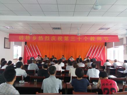 9月10日,砖桥乡隆重召开“热烈庆祝第三十个教师节”表彰大会,并对我乡在教育工作中做出突出贡献的优秀教师和先进个人进行表彰。县教育局党委委员、工会主席易家旺同志、县教育局监察室主任蓝健科同志、砖桥乡党政班子成员、乡全体教职工等共70余人参与此次表彰大会。