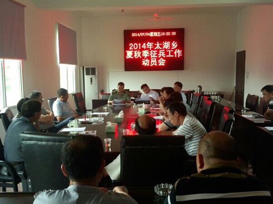 为确保今年征兵工作顺利进行,近日,太湖乡召开2014年夏秋季征兵工作动员会,太湖乡乡长林辉、乡党委委员、武装部部长文永忠出席会议,各村民兵营长参加会议。