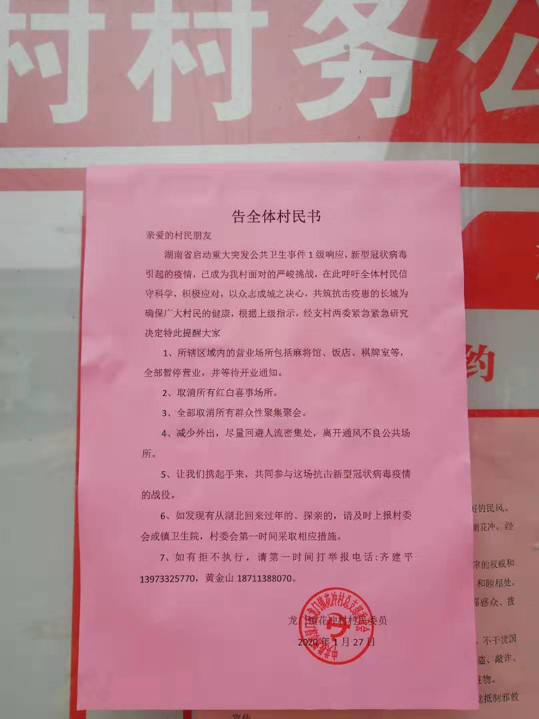 疫情防控工作开展以来,全镇各村持续不断多方式多角度开展宣传动员工作,目的只有一个,就是要让所有龙门的村民都知道,打赢这场疫情防控阻击战不能光靠哪一个人,要靠大家齐心协力,一个都不能少!连日来,全镇各村党组织党员干部、妇联执委均积极自发行动,有的在村口粘贴手写宣传标语,发放告村民书,有的妇联执委们主动上门做工作,镇上的宣传车每天马不停蹄的在村组连轴转,村里的大喇叭也喊起来了,号召返乡人员向村上报告行程和健康状况,也号召广大村民减少出行,不要聚会。