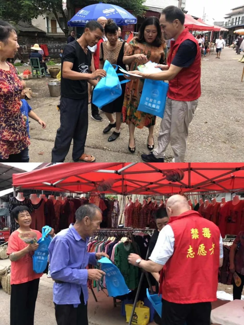 正值赶集日,街上人来人往。“大姐,提这么多东西挺累吧。来,到这边休息一下,我顺便跟您讲解一下禁毒知识吧!”禁毒志愿者们热情地将印有禁毒宣传标语的小礼品递给过往群众,教他们识别新型毒品的技巧和预防毒品的相关知识。