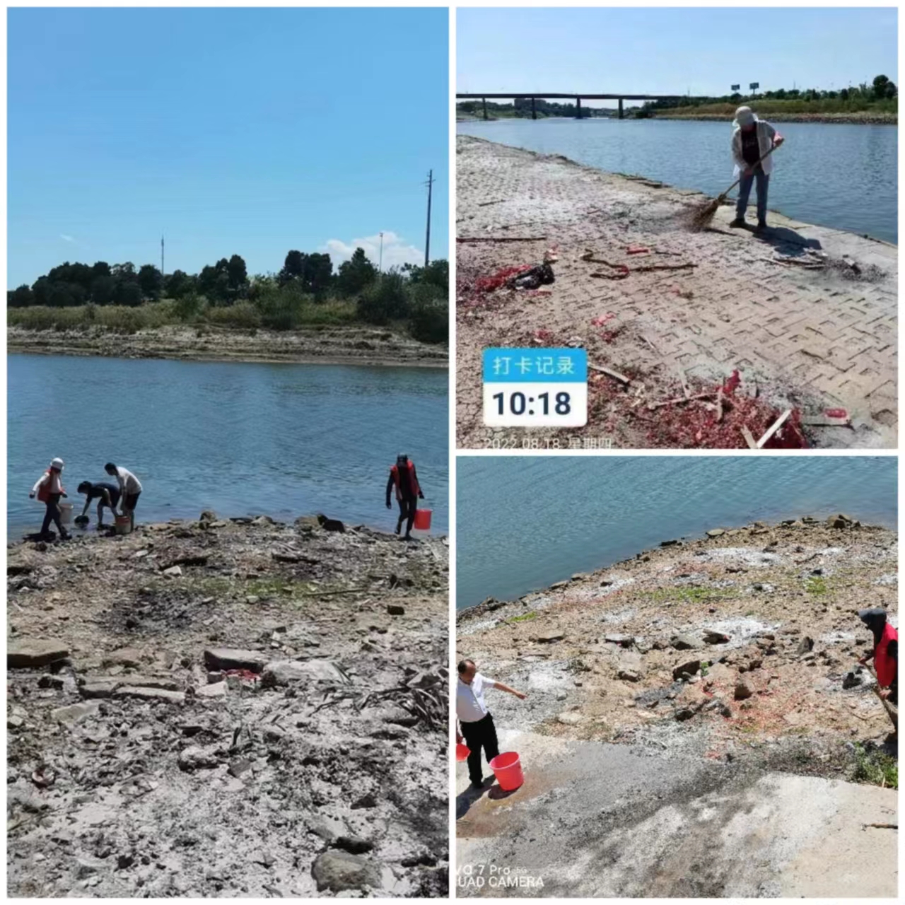 村级河长及志愿者们顶着烈日经过一上午的辛勤劳作,让渌江河滩又恢复到整洁、干净状态。