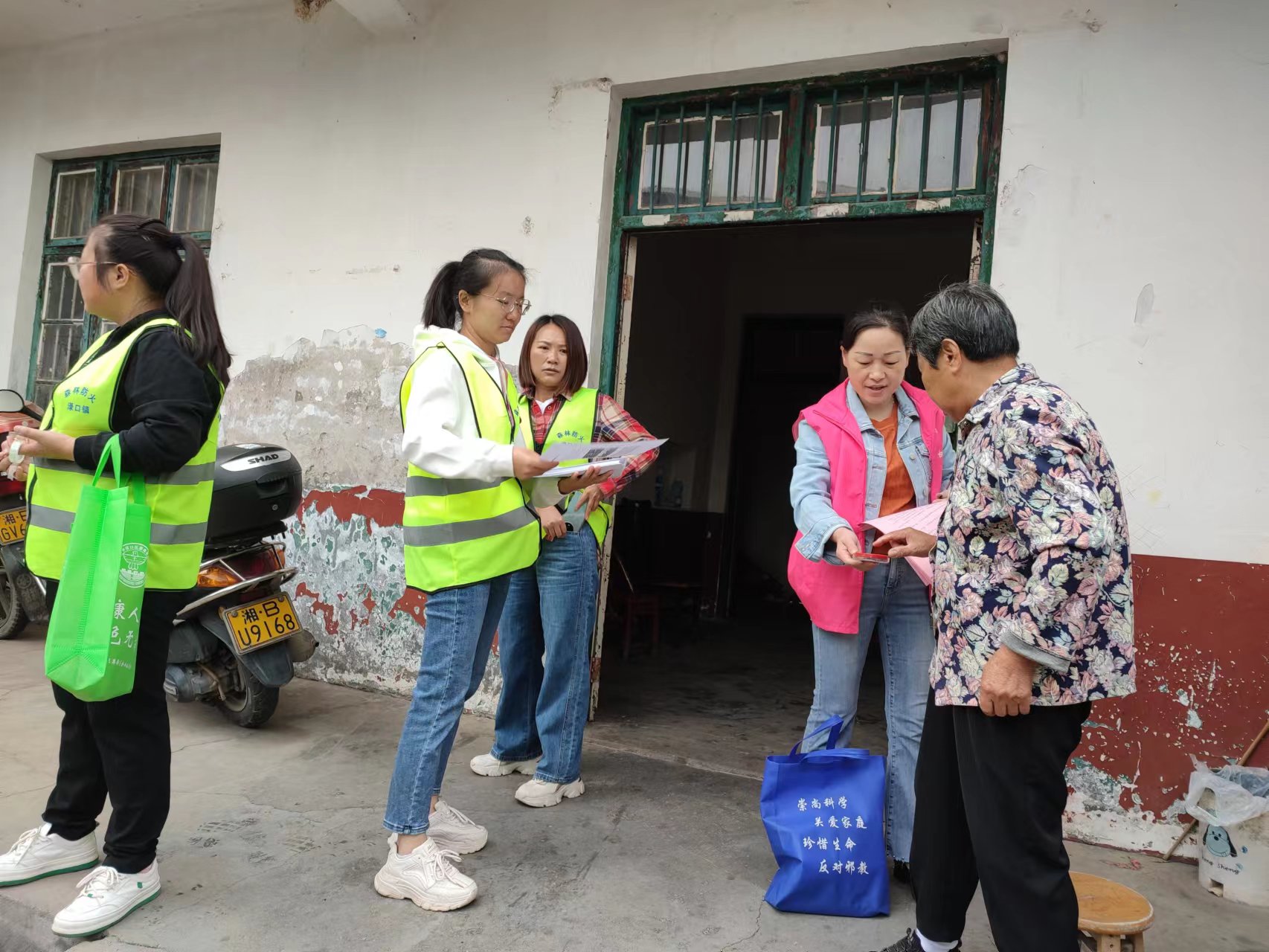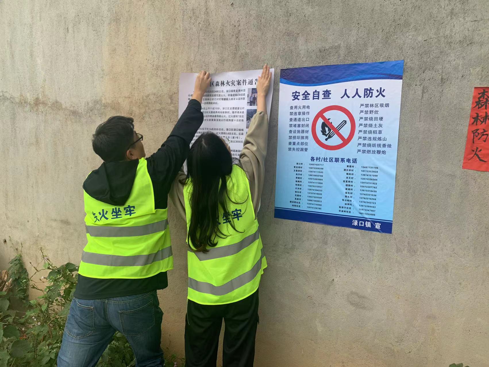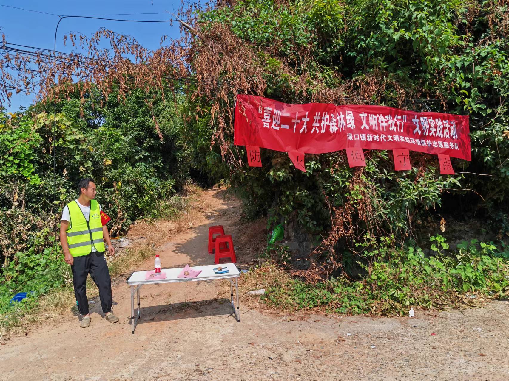 渌口镇以党建引领抓手,以新时代文明实践所(站)为载体,自9月25日起渌口镇召开森林防灭火安排部署会起,就给23个村(社区)下发了"喜迎二十大、共护森林绿、文明伴我行"森林防灭火文明实践活动的宣传横幅,要求各村悬挂在进山口值守点。同时发动300余名镇村干部、23名护林员、500余名群众组成渌口镇新时代文明实践环境保护志愿服务队。每一名志愿者身穿"森林防火"标志的黄马甲和带上"渌口镇志愿者"的红袖章,开展森林防灭火入户宣传、义务巡逻、应急灭火等志愿服务活动,用实际行动践行了新时代文明实践志愿服务精神,彰显了责任与担当。这些"黄马甲"和"红袖章"在渌口镇形成了一道靓丽的风景线,吸引了越来越多的群众加入到志愿者队伍中来。