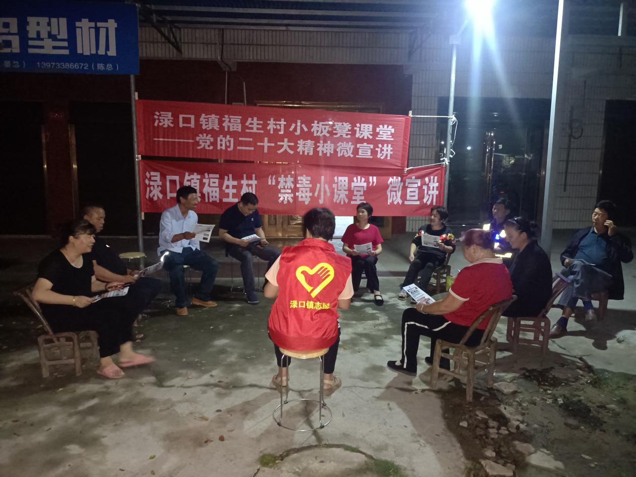 在福生村小良老屋组,福生村新时代文明实践志愿服务队组织开展了一场以"禁毒我先行,文明树新风"为主题的小板凳课堂。志愿者李日完结合习近平总书记的相关论述以及实际案例,向居民开展宣讲,教育广大村民形成"健康人生、绿色无毒"的生活方式,为推动移风易俗,营造良好的社会氛围。