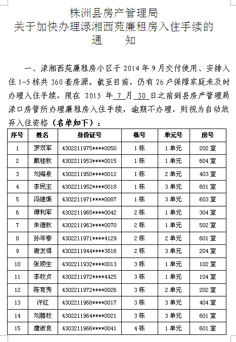 株洲县房产管理局关于加快办理渌湘西苑廉租房入住手续的通知