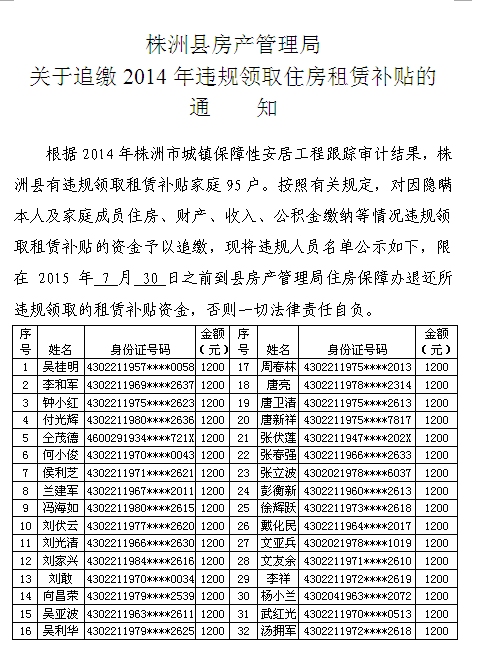 株洲县房产管理局关于追缴2014年违规领取住房租赁补贴的通知