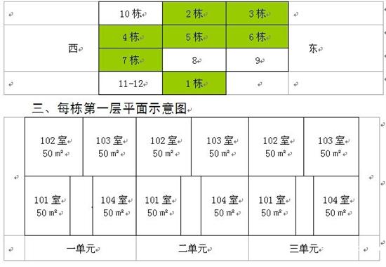 配租房源:1-7栋廉租住房共504套 房源结构:每栋六层,三个单元,每单元二十四户,共72套 房源户型:二室一厅一厨一卫 二、 栋号平面图(绿色为配租房源)