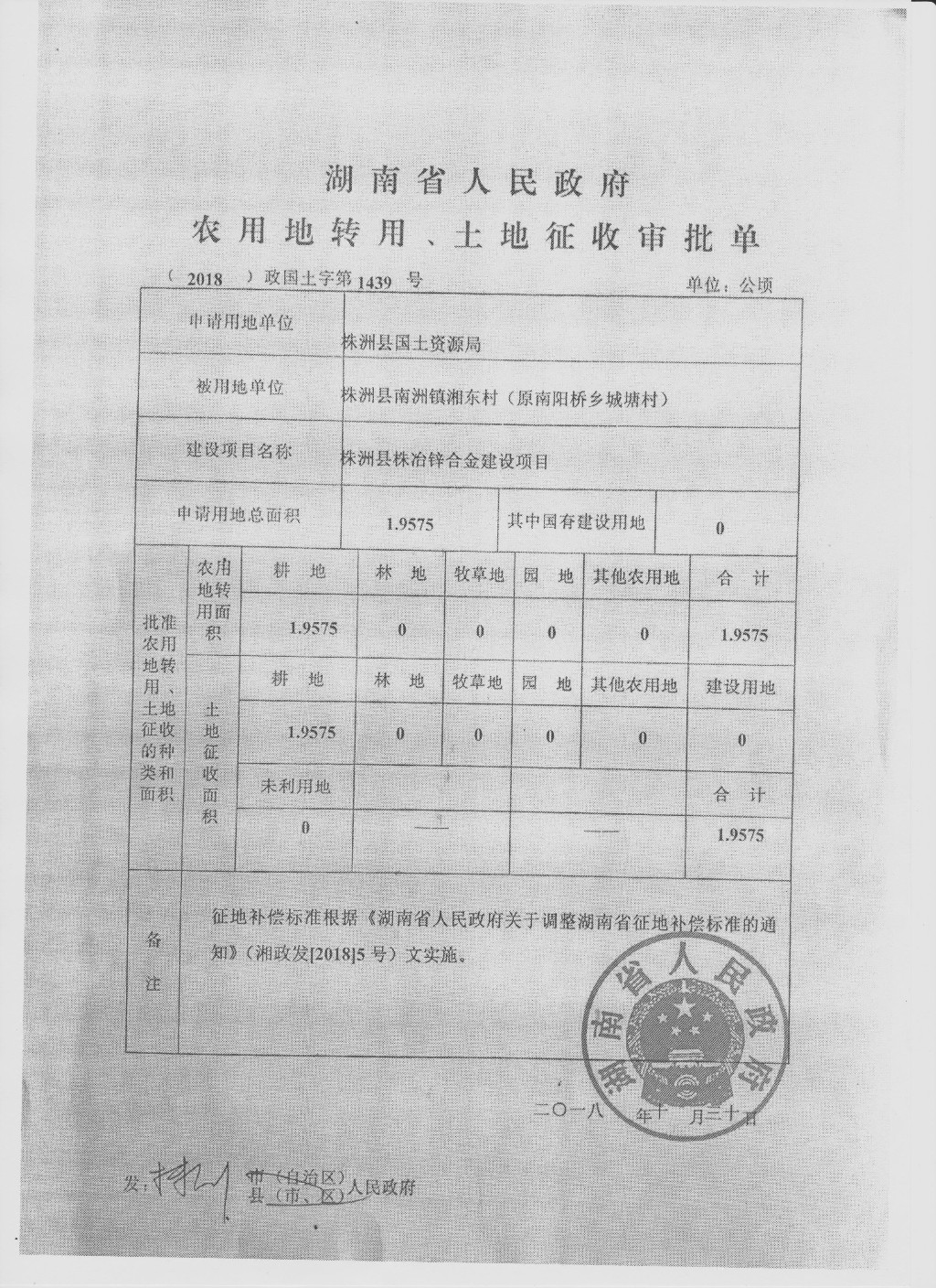 株洲县株冶锌合金建设项目农用地转用、土地征收审批单