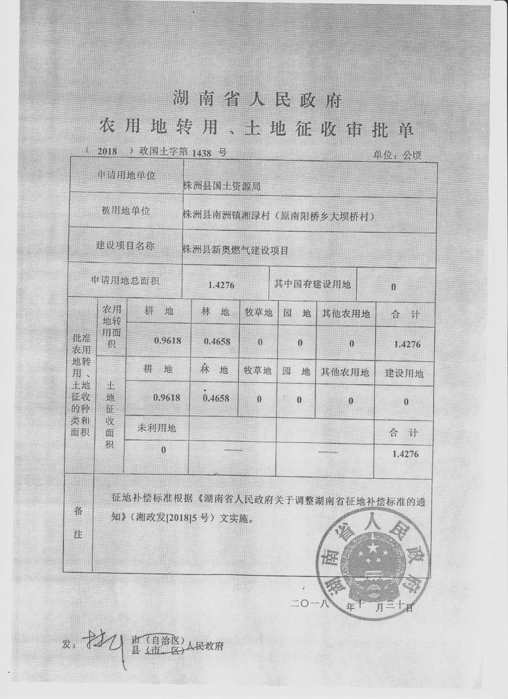 株洲县新奥燃气建设项目农用地转用、土地征收审批单