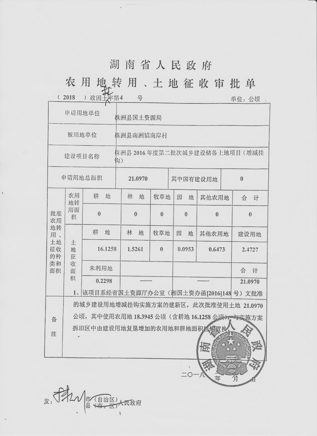 株洲县2016年度第二批次城乡建设储备土地项目(增减挂钩)农用地转用、土地征收审批单