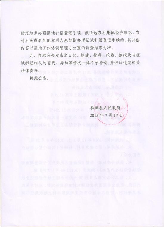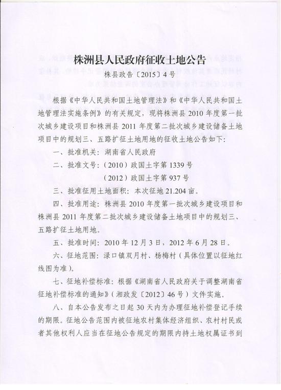 株县政告(2015)4号株洲县渌口镇双月村、杨梅村规划三、五路扩征土地用地征地公告