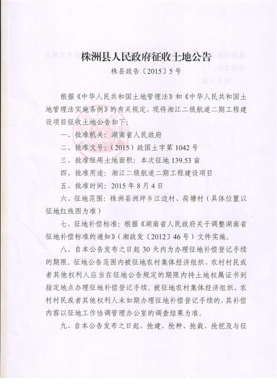 株县政告(2015)5号株洲县洲坪乡江边村、荷塘村湘江二级航道二期工程建设项目征地公告