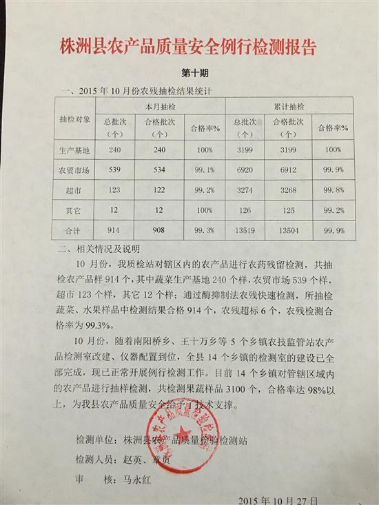 2015年株洲县农产品质量安全例行检测报告 第十期