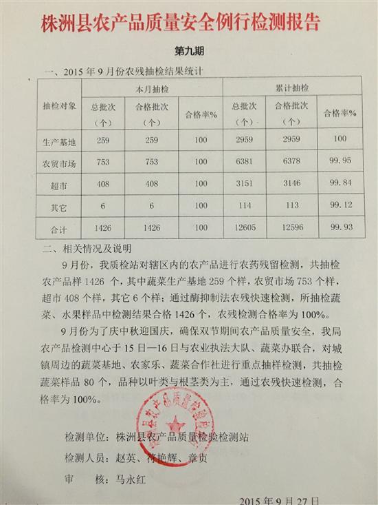 2015年株洲县农产品质量安全例行检测报告 第九期
