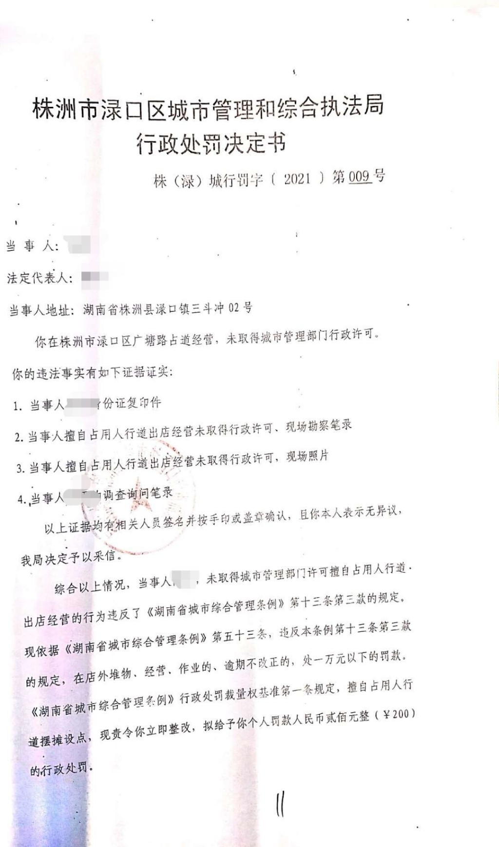 你在株洲市渌口区广塘路占道经营,未取得城市管理部门行政许可。