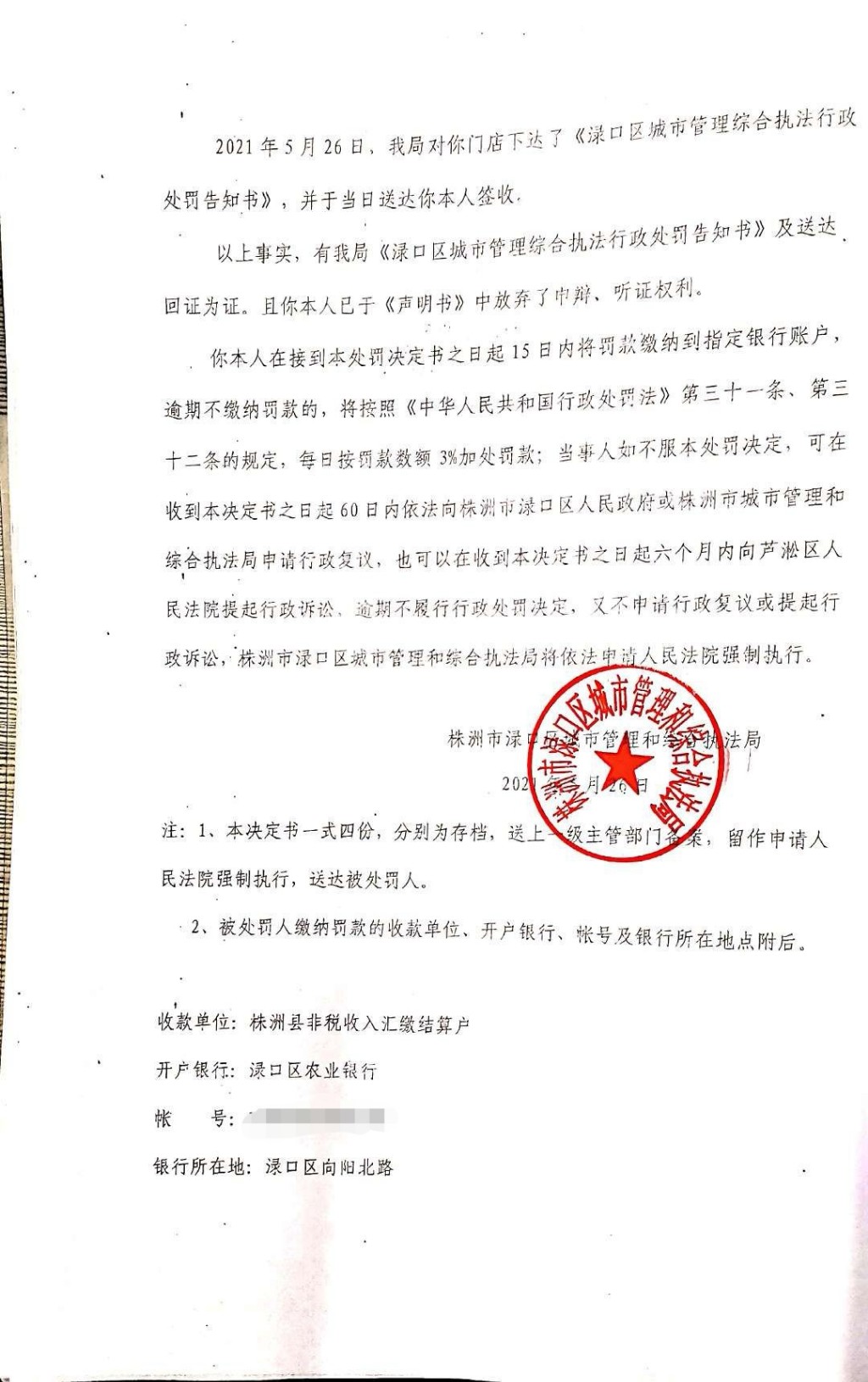 2021年5月26日,我局对你门店下达了《渌口区城市管理综合执法行政处罚告知书》,并于当日送达你本人签收。