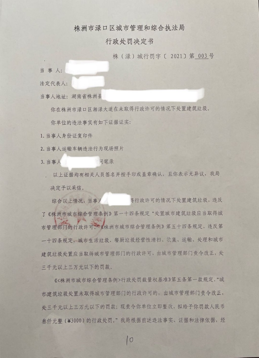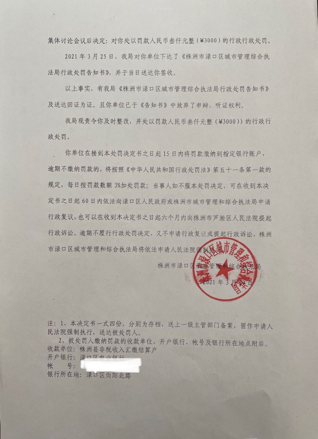 株洲市渌口区城市管理和综合执法局行政处罚决定书株(渌)城行罚字〔2021〕第003号