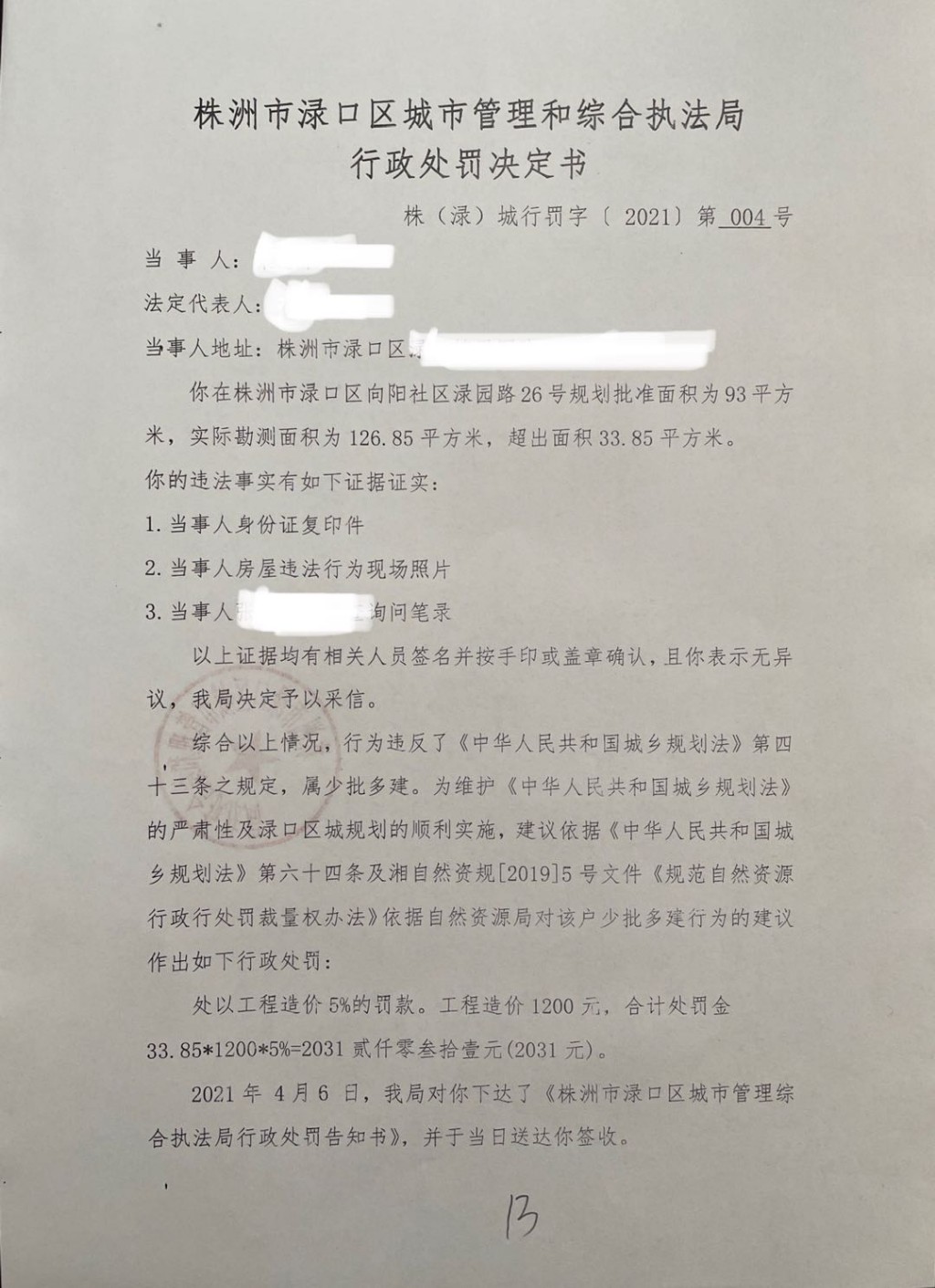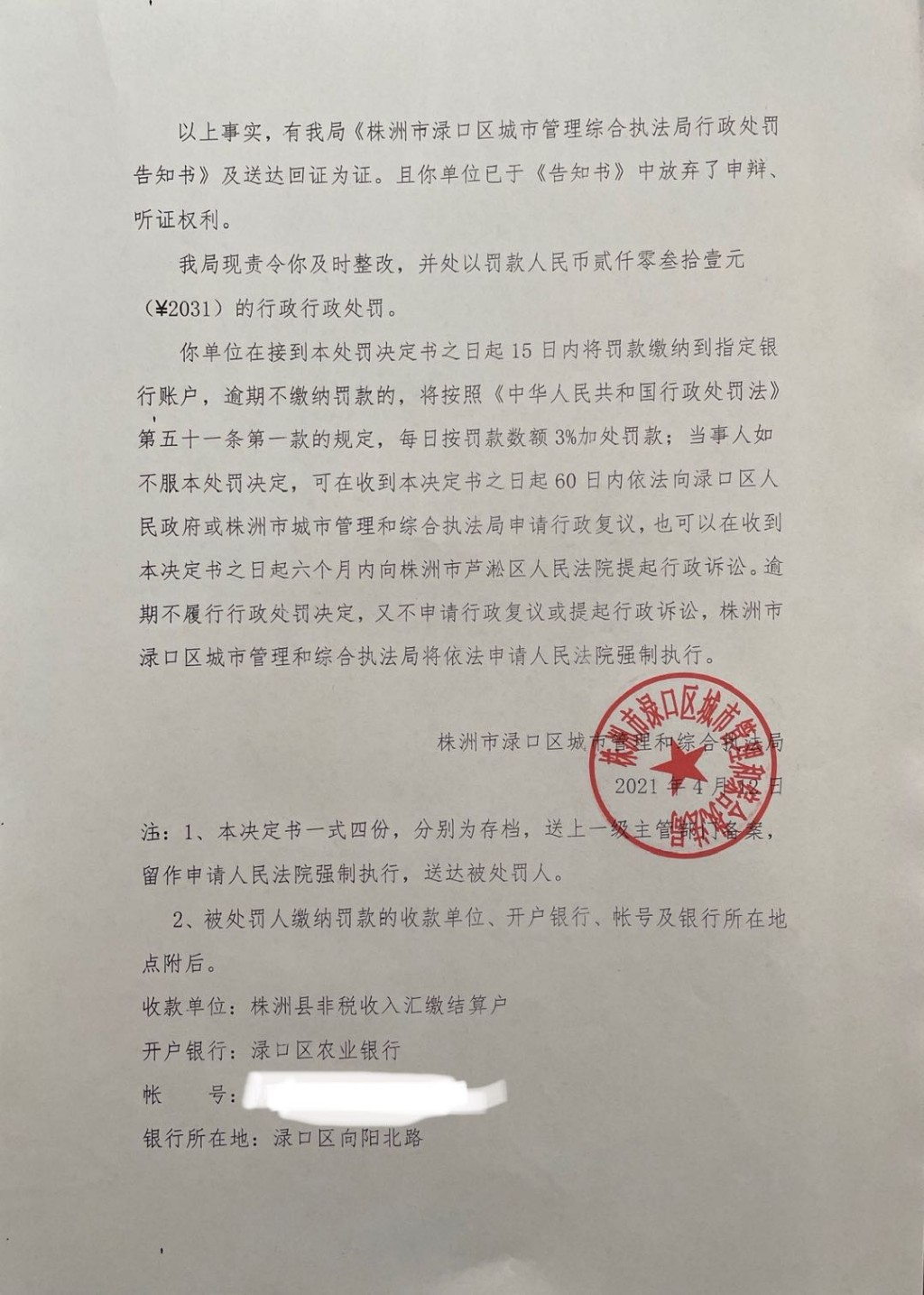 株洲市渌口区城市管理和综合执法局行政处罚决定书株(渌)城行罚字〔2021〕第004号