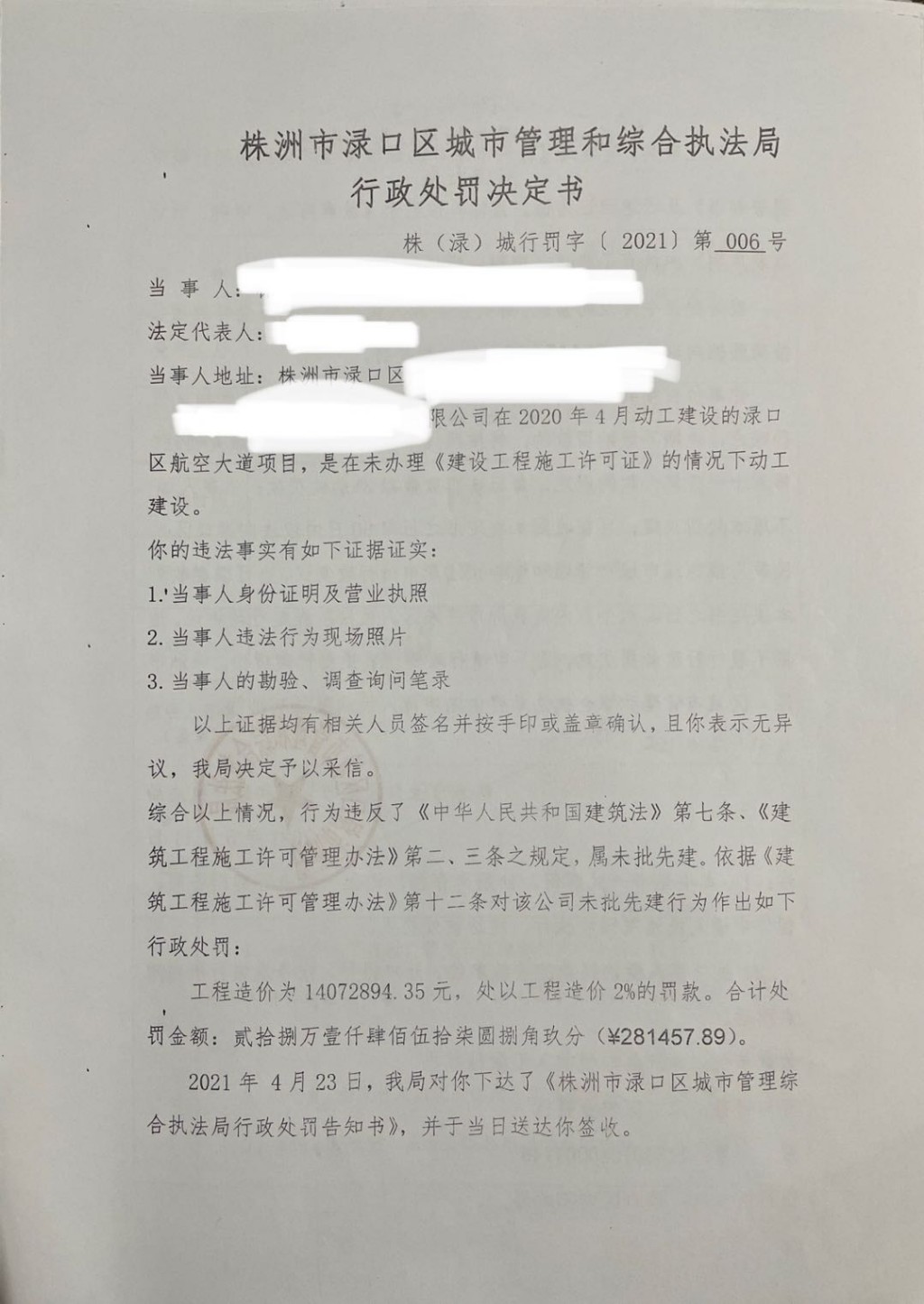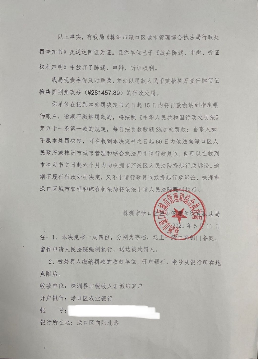 株洲市渌口区城市管理和综合执法局行政处罚决定书株(渌)城行罚字〔2021〕第006号