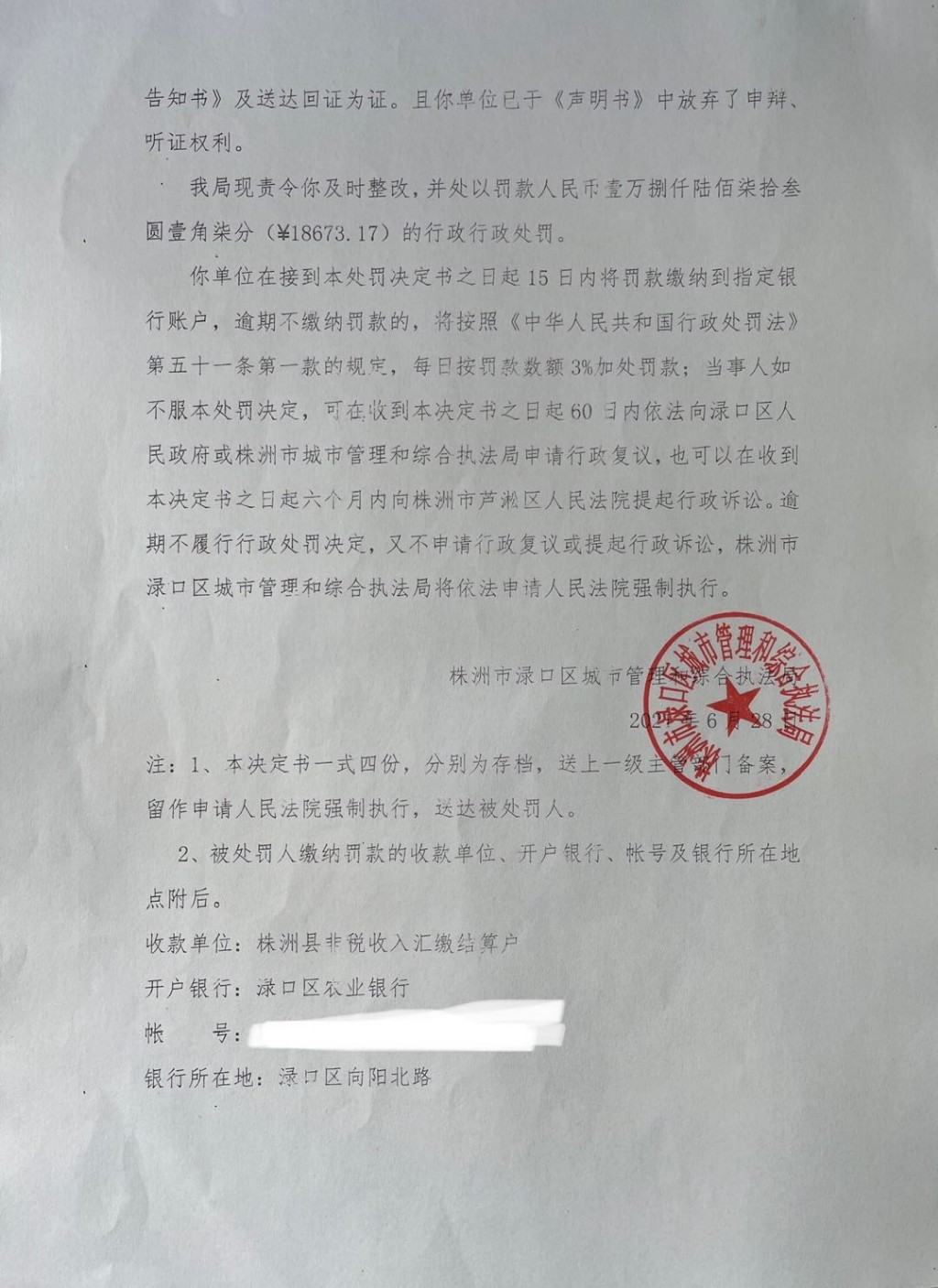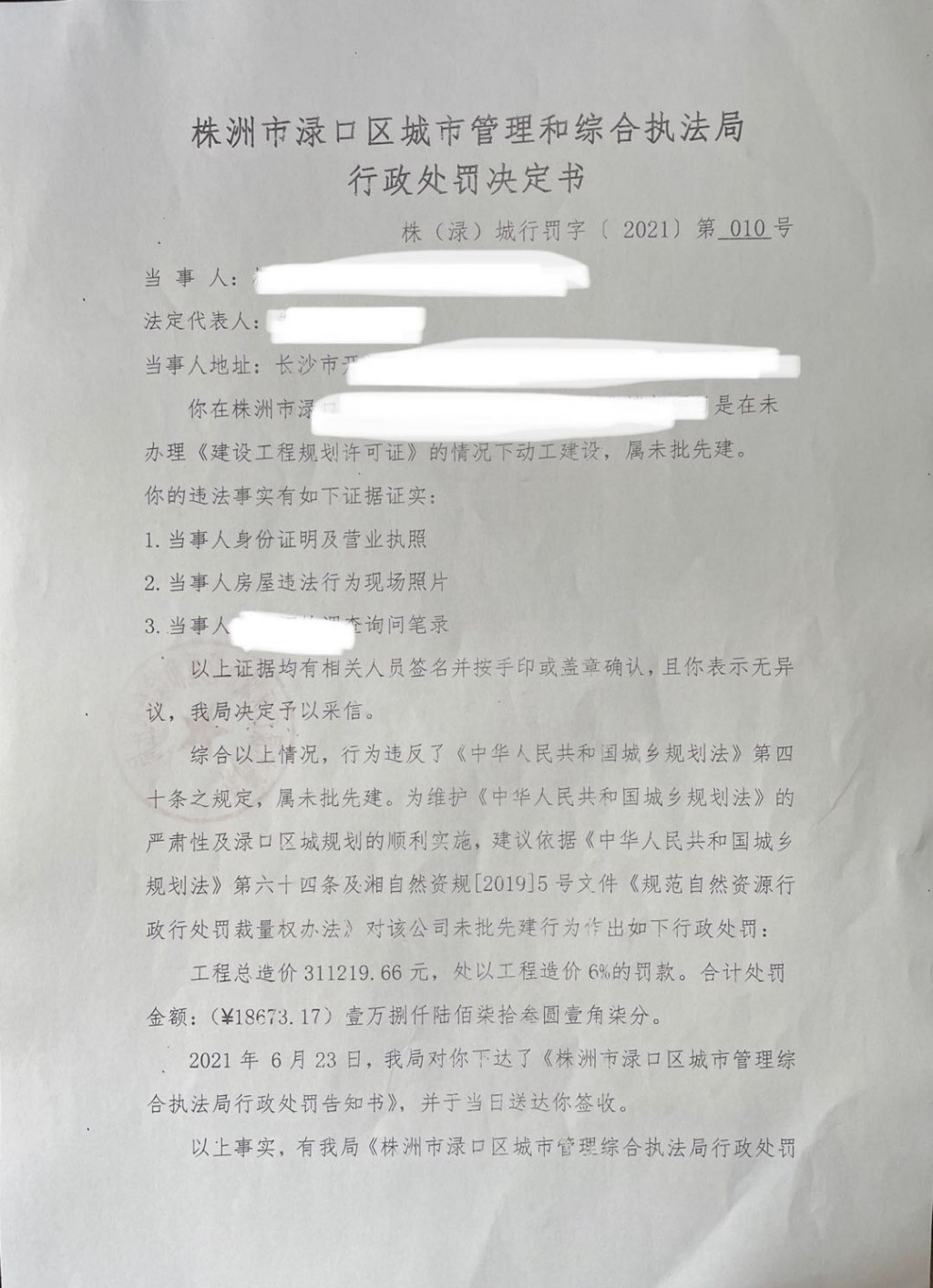 株洲市渌口区城市管理和综合执法局行政处罚决定书株(渌)城行罚字〔2021〕第010号