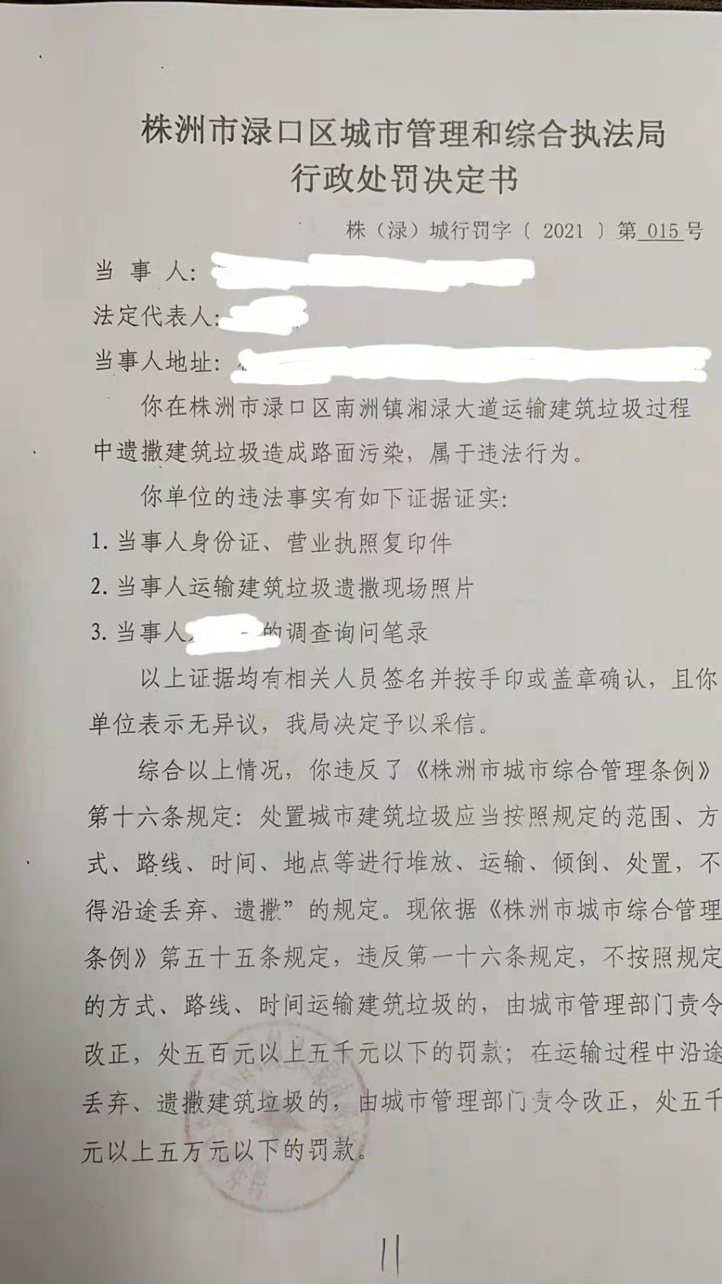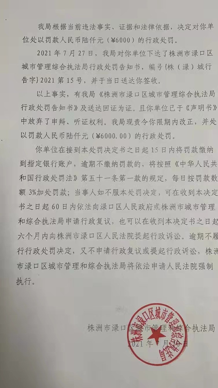 株洲市渌口区城市管理和综合执法局行政处罚决定书株(渌)城行罚字〔2021〕第015号