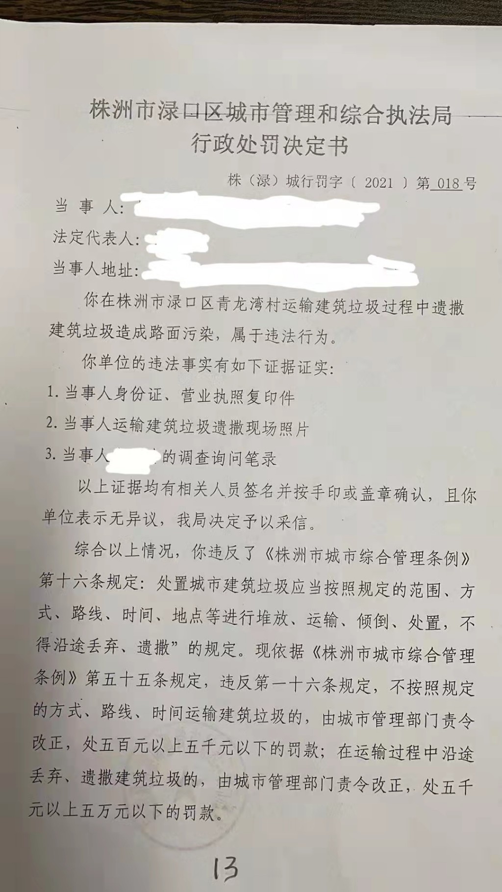 株洲市渌口区城市管理和综合执法局行政处罚决定书株(渌)城行罚字〔2021〕第018号