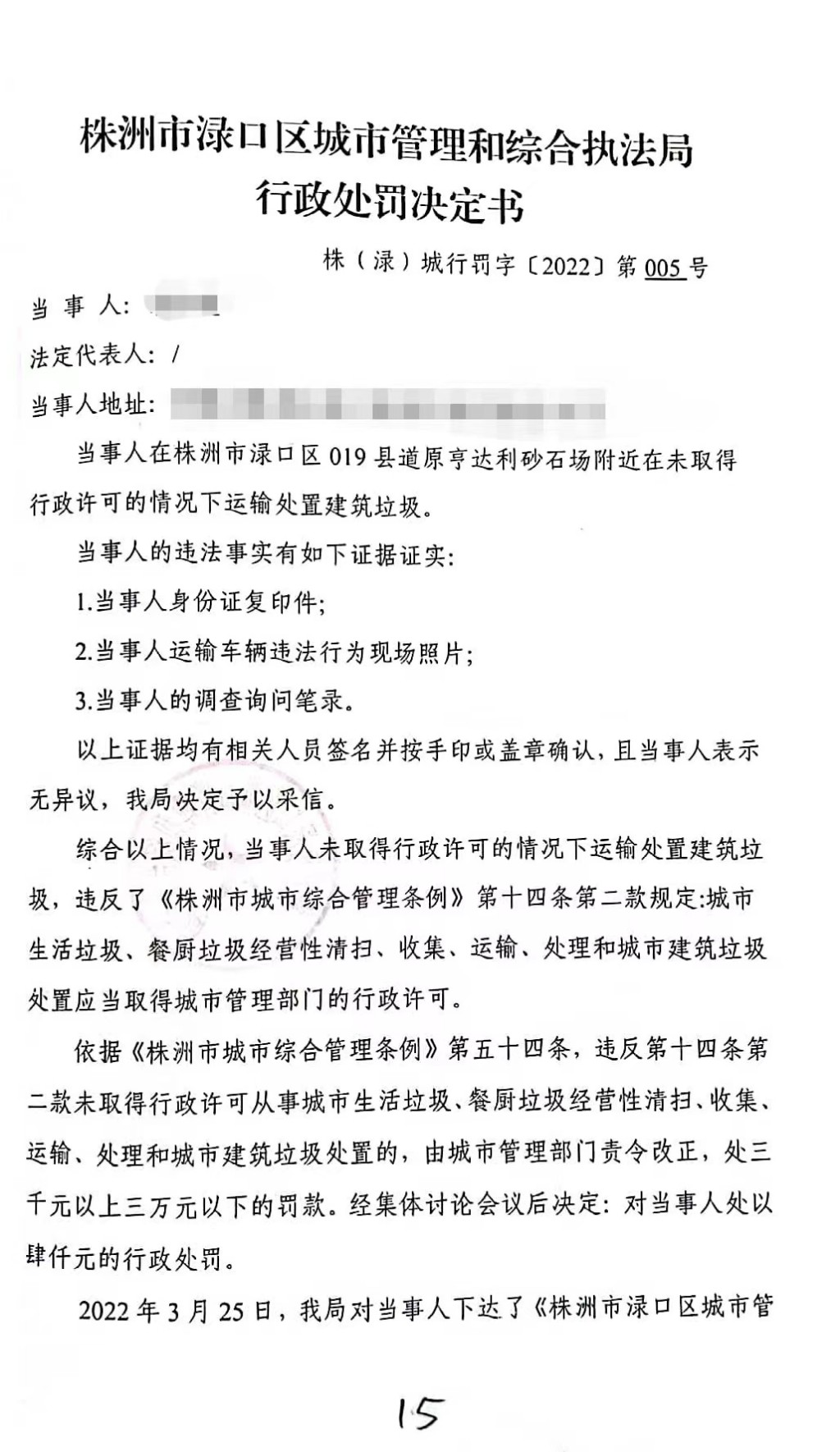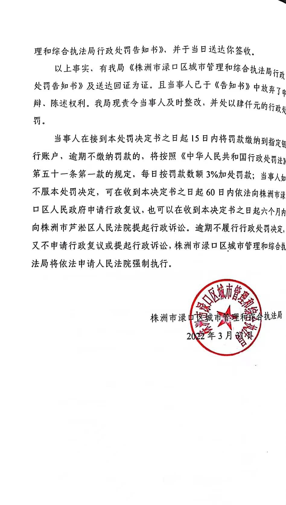株洲市渌口区城市管理和综合执法局行政处罚决定书 株(渌)城行罚字〔 2022〕第005号