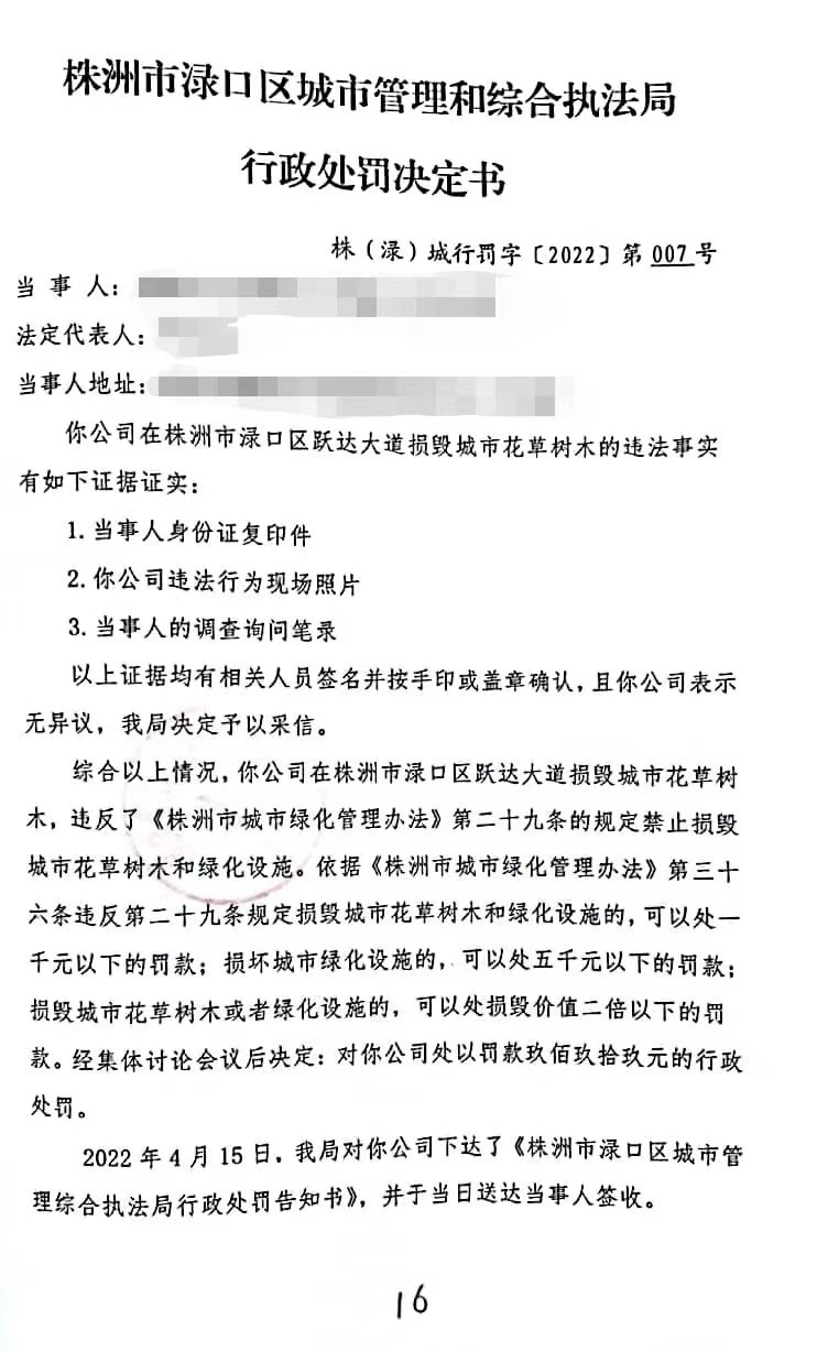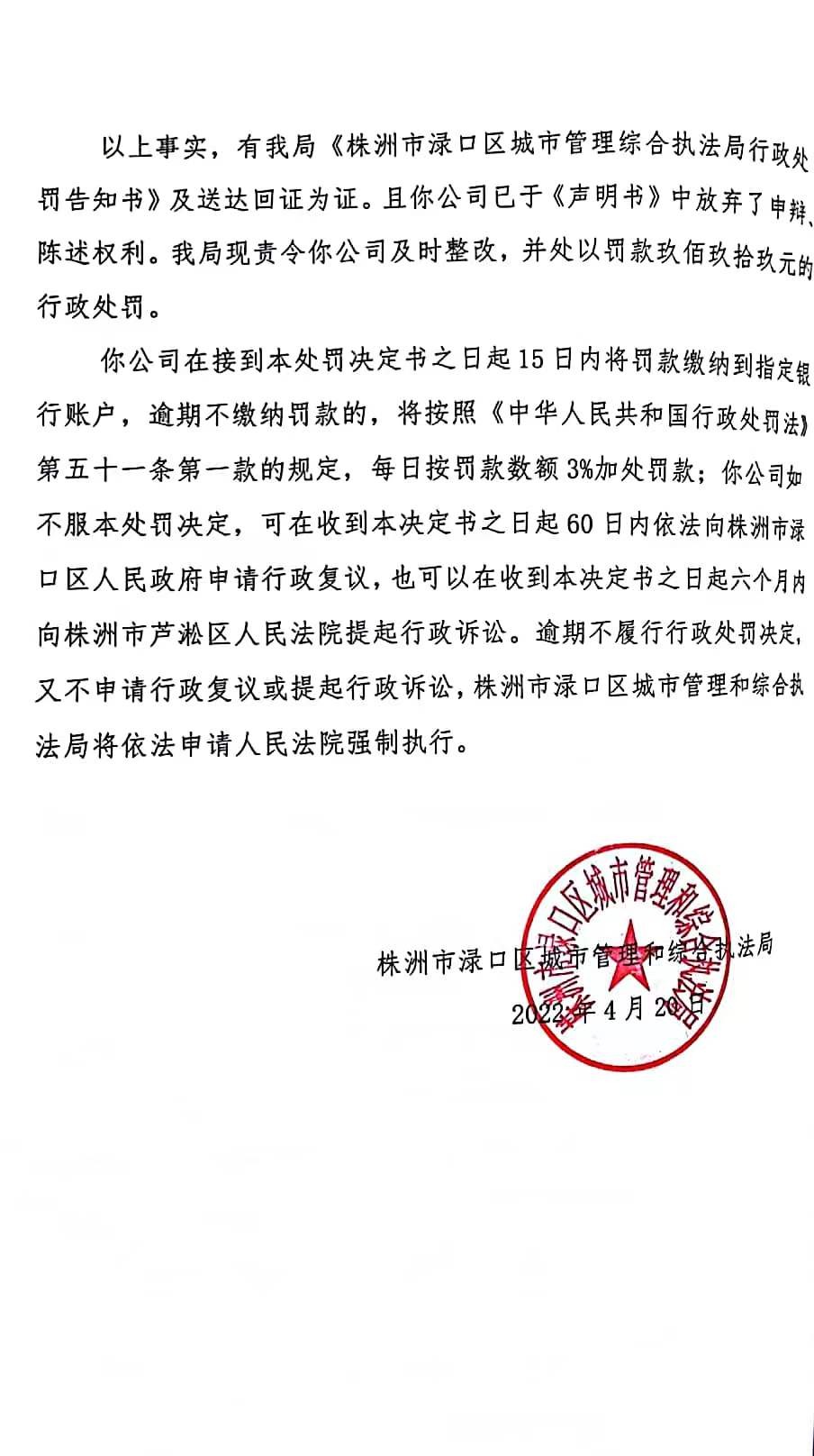 株洲市渌口区城市管理和综合执法局行政处罚决定书 株(渌)城行罚字〔 2022〕第007号
