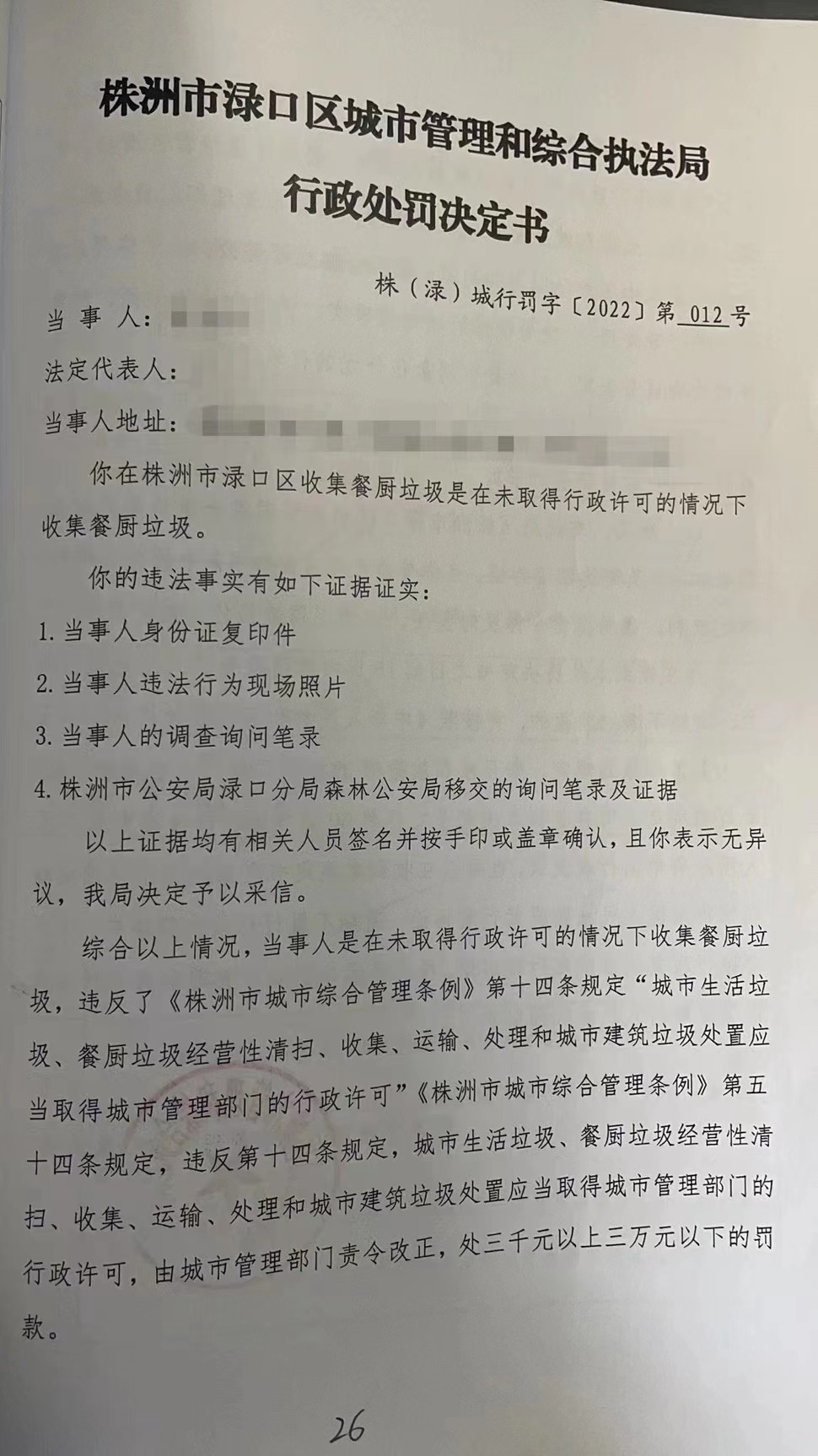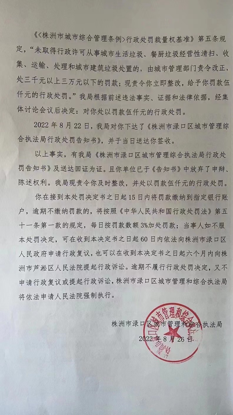 株洲市渌口区城市管理和综合执法局行政处罚决定书 株(渌)城行罚字〔 2022〕第012号