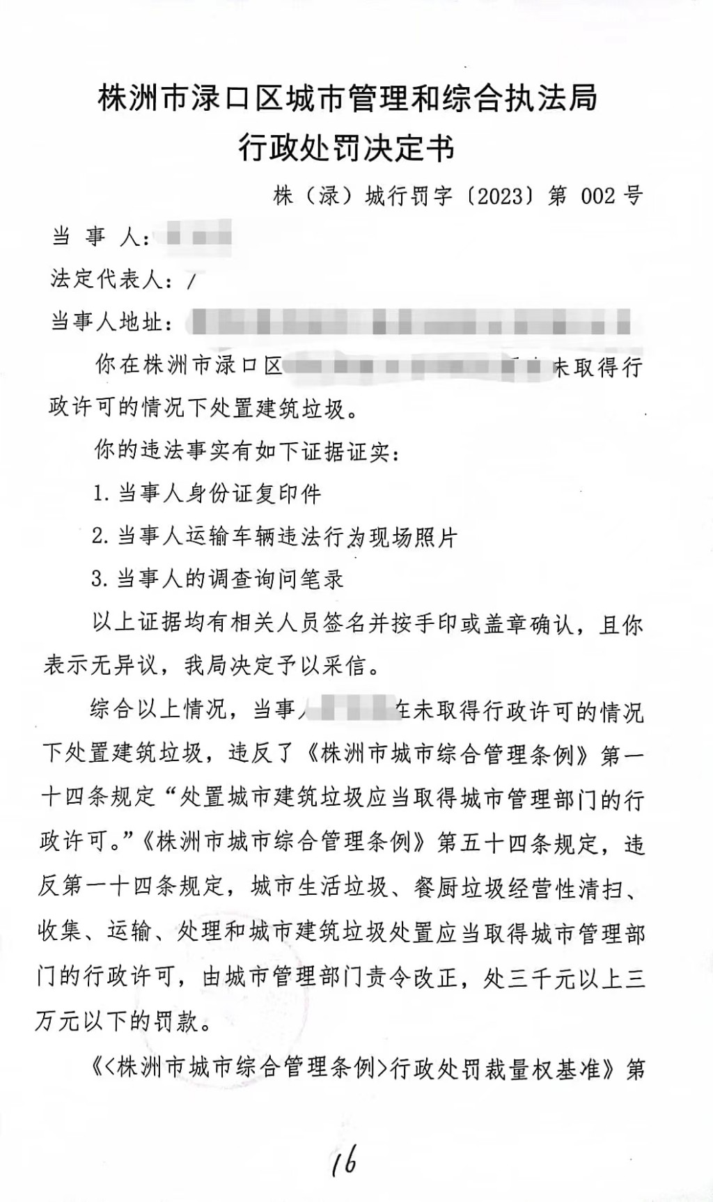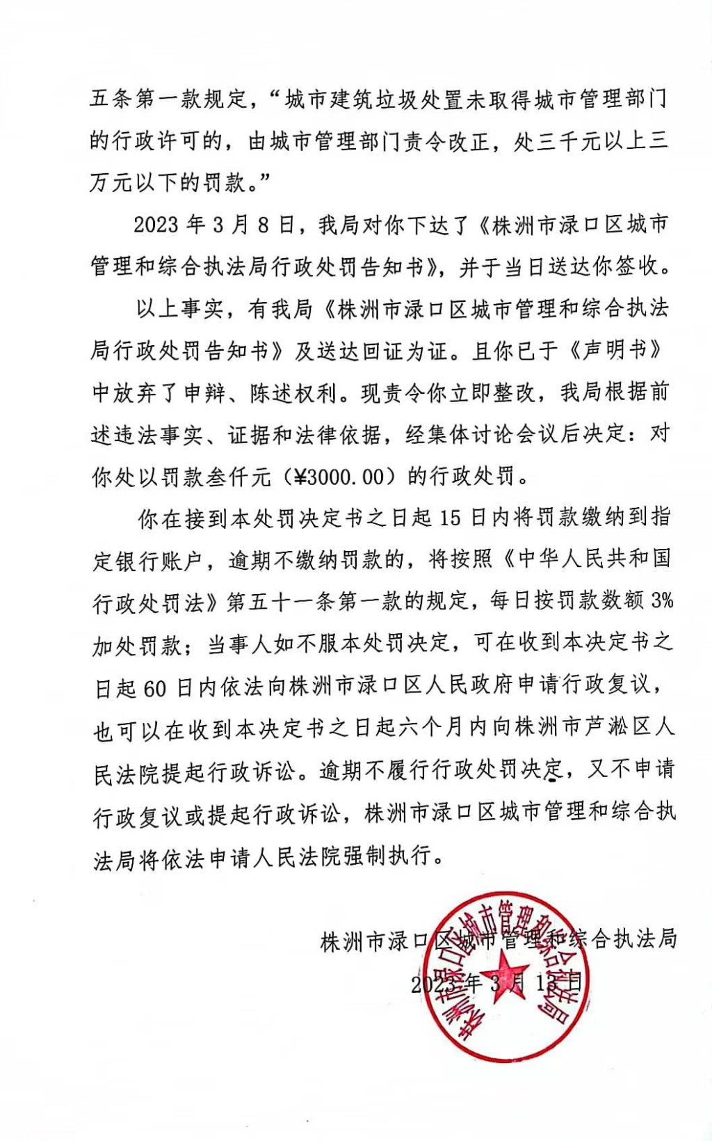 株洲市渌口区城市管理和综合执法局行政处罚决定书 株(渌)城行罚字〔 2023〕第002号