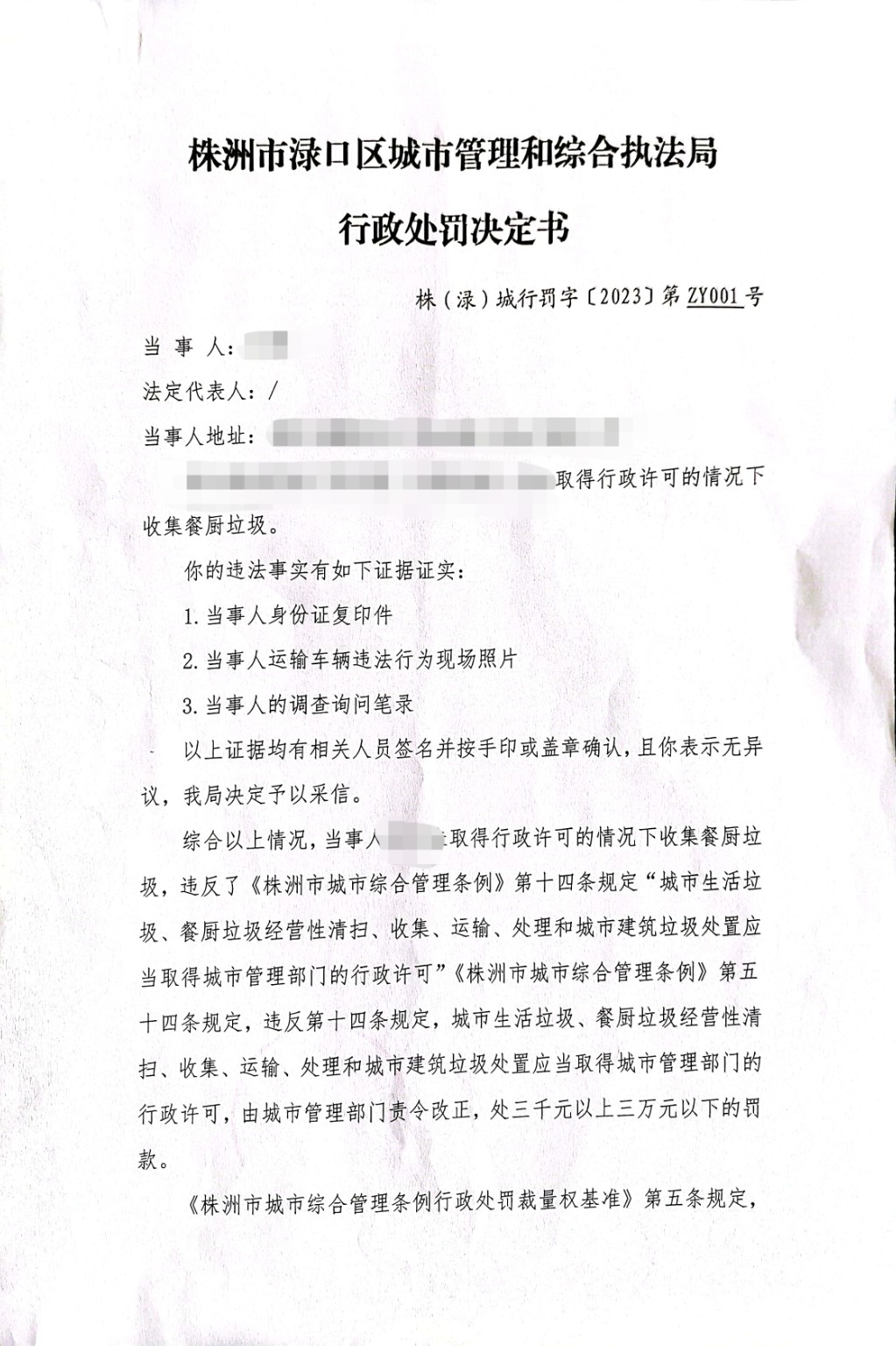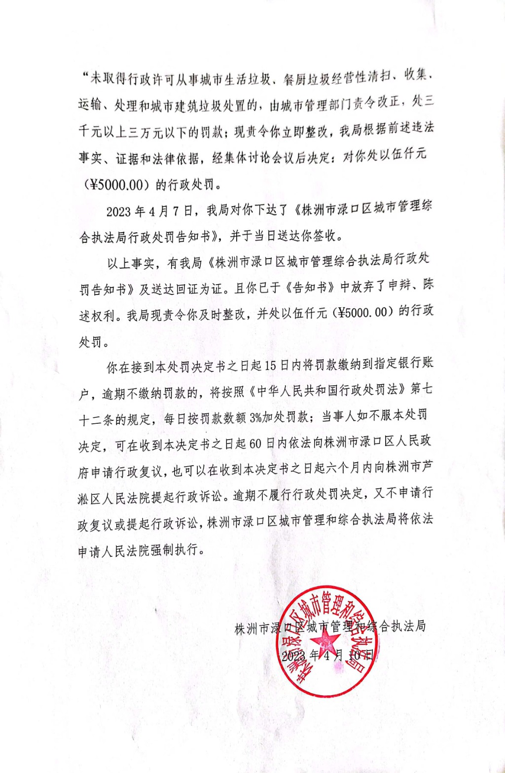 株洲市渌口区城市管理和综合执法局 行政处罚决定书 株(渌)城行罚字〔2023〕第ZY001号