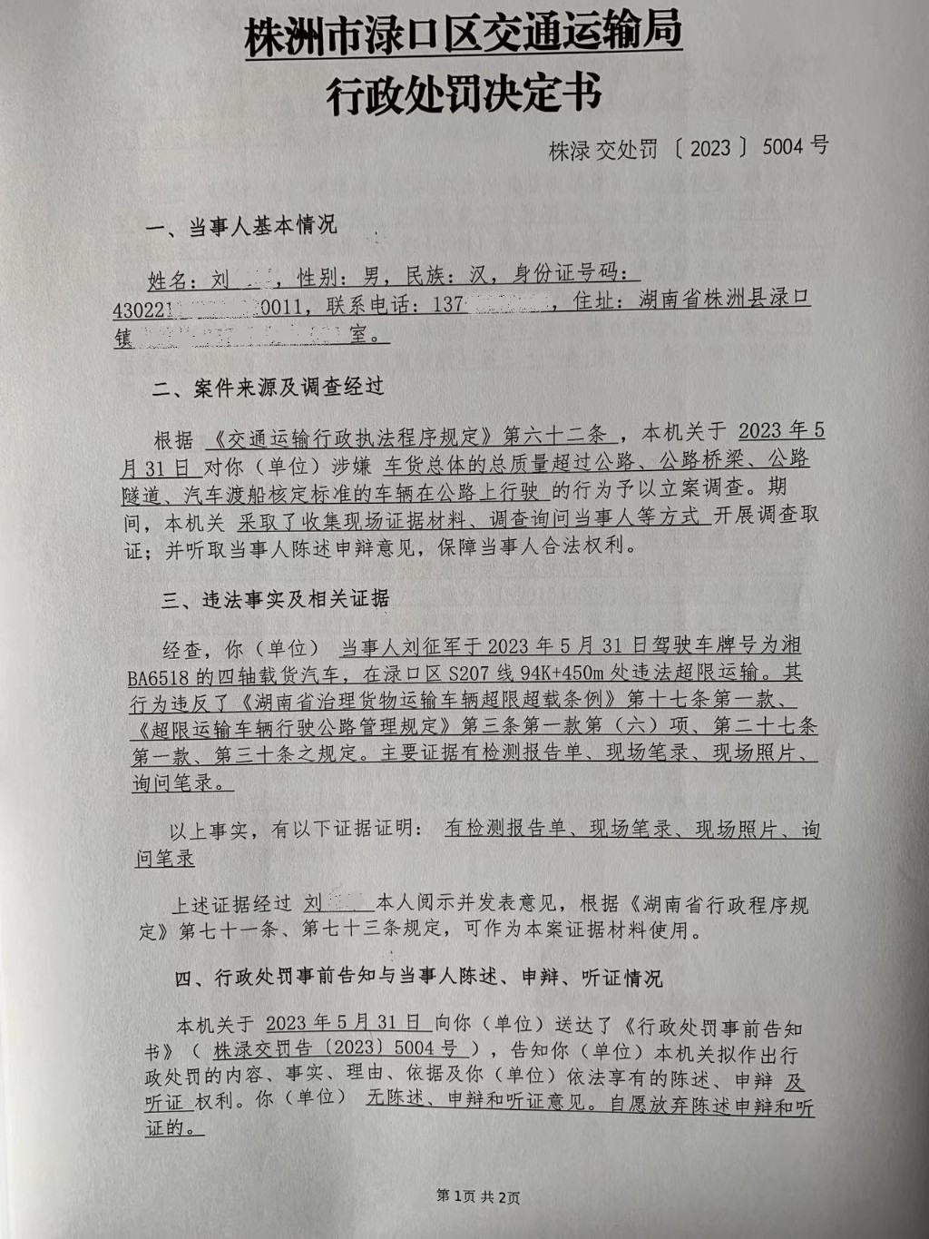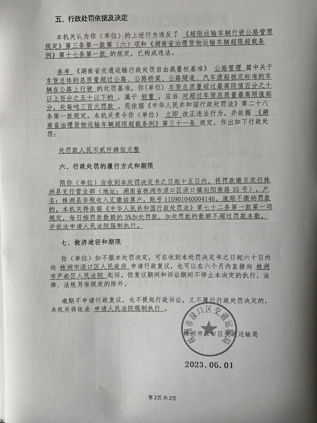 株洲市渌口区交通运输局行政处罚决定书株渌交处罚决定〔2023〕5004号