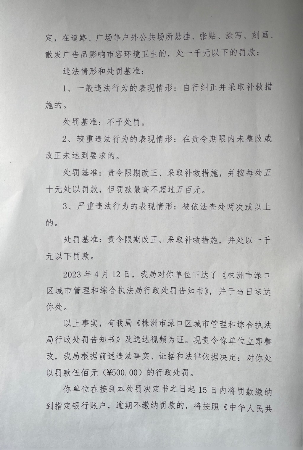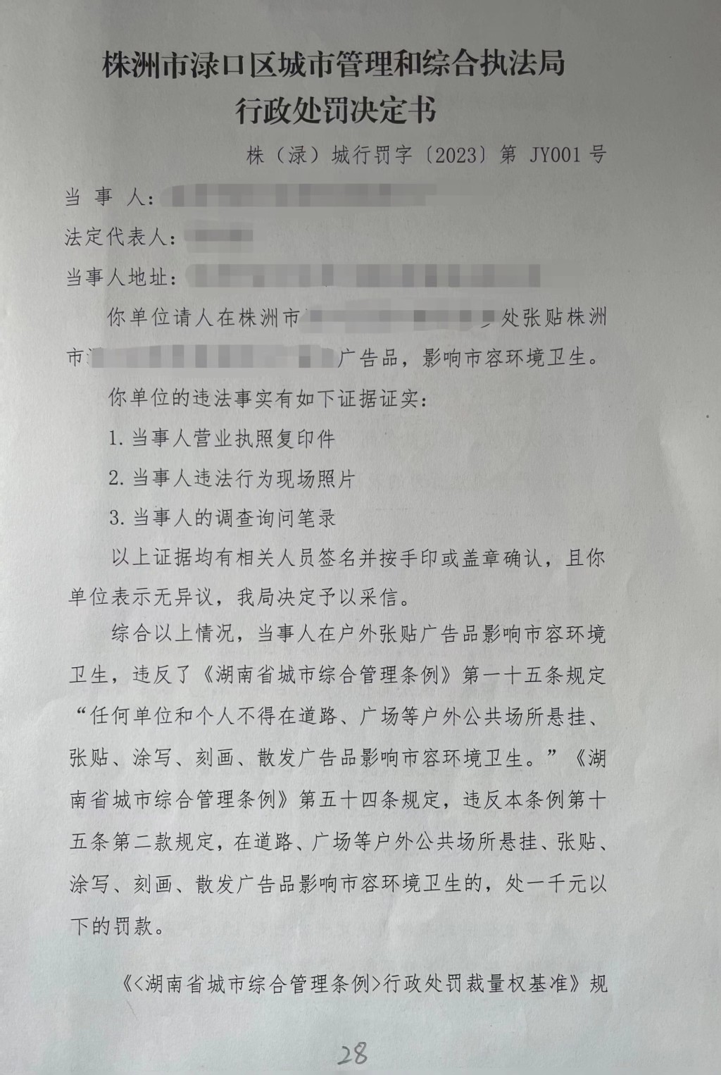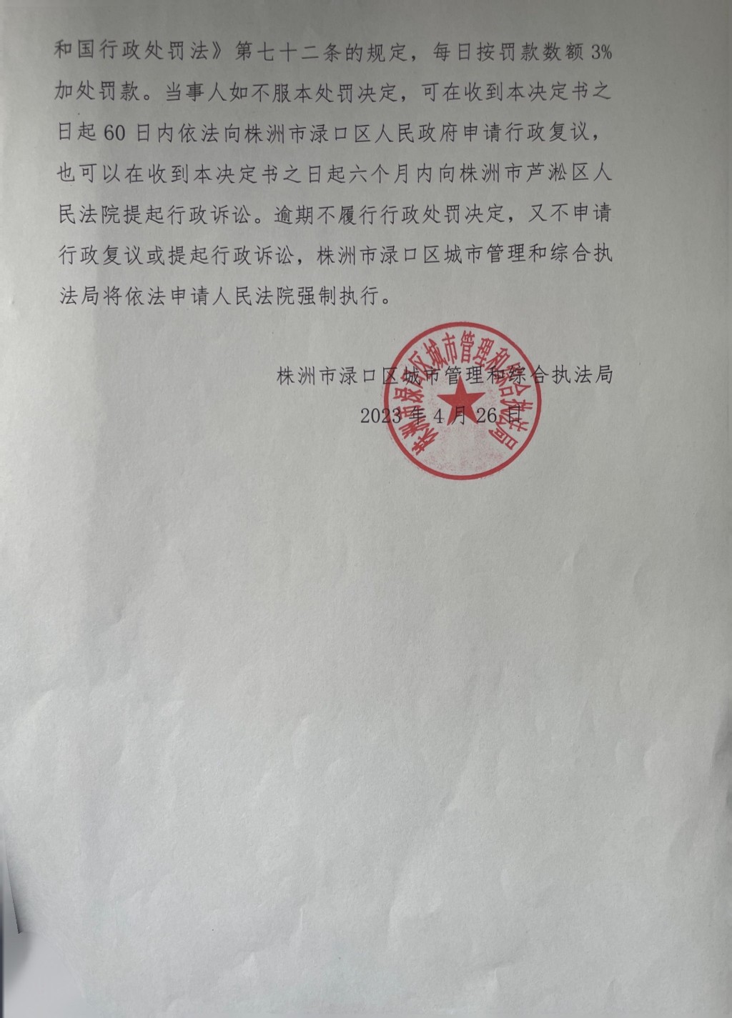 株洲市渌口区城市管理和综合执法局 行政处罚决定书 株(渌)城行罚字〔2023〕第JY001号