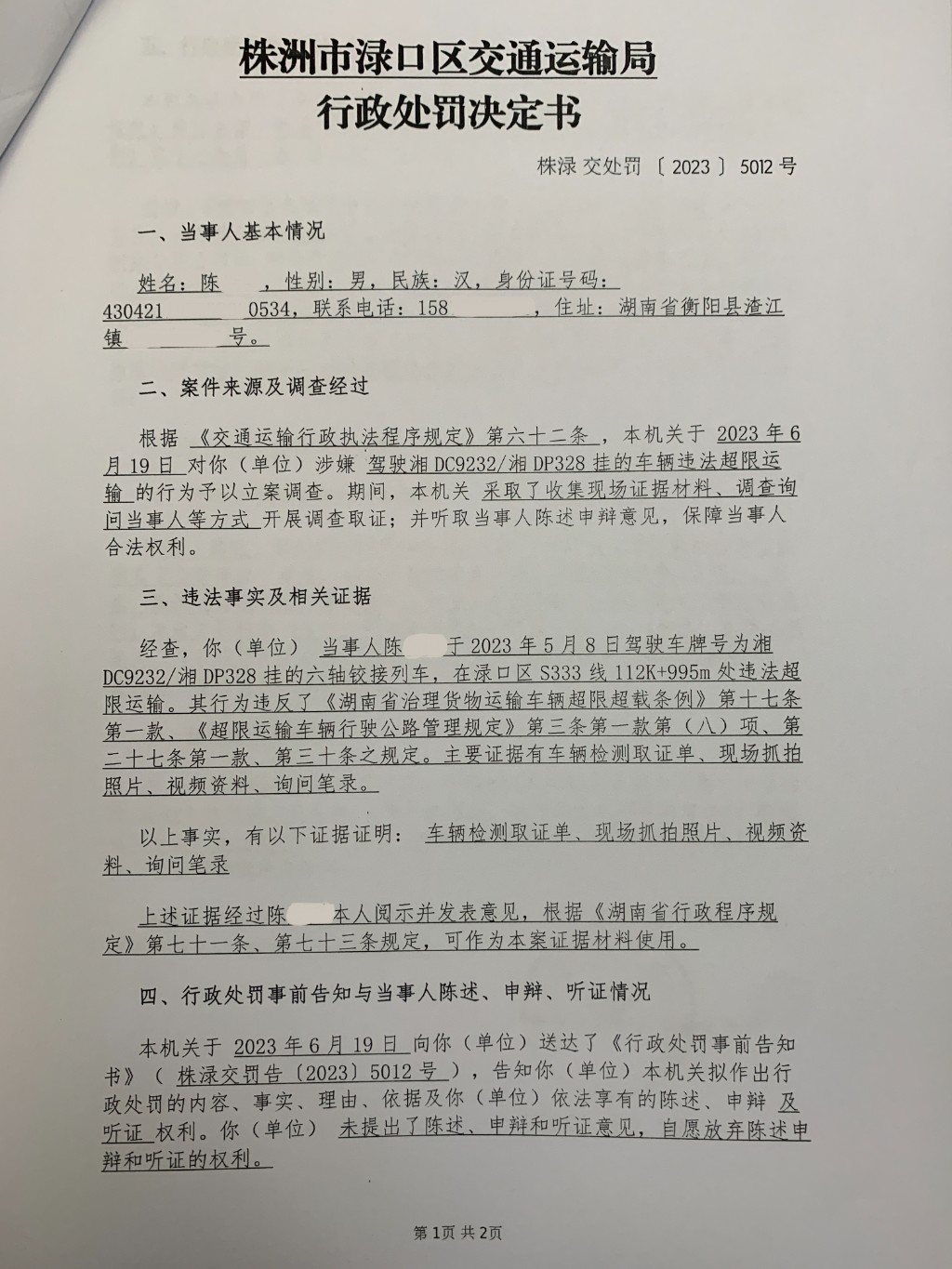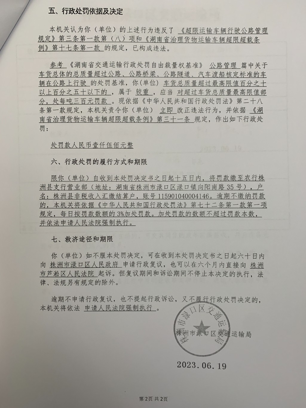 株洲市渌口区交通运输局行政处罚决定书株渌交处罚〔2023〕5012号