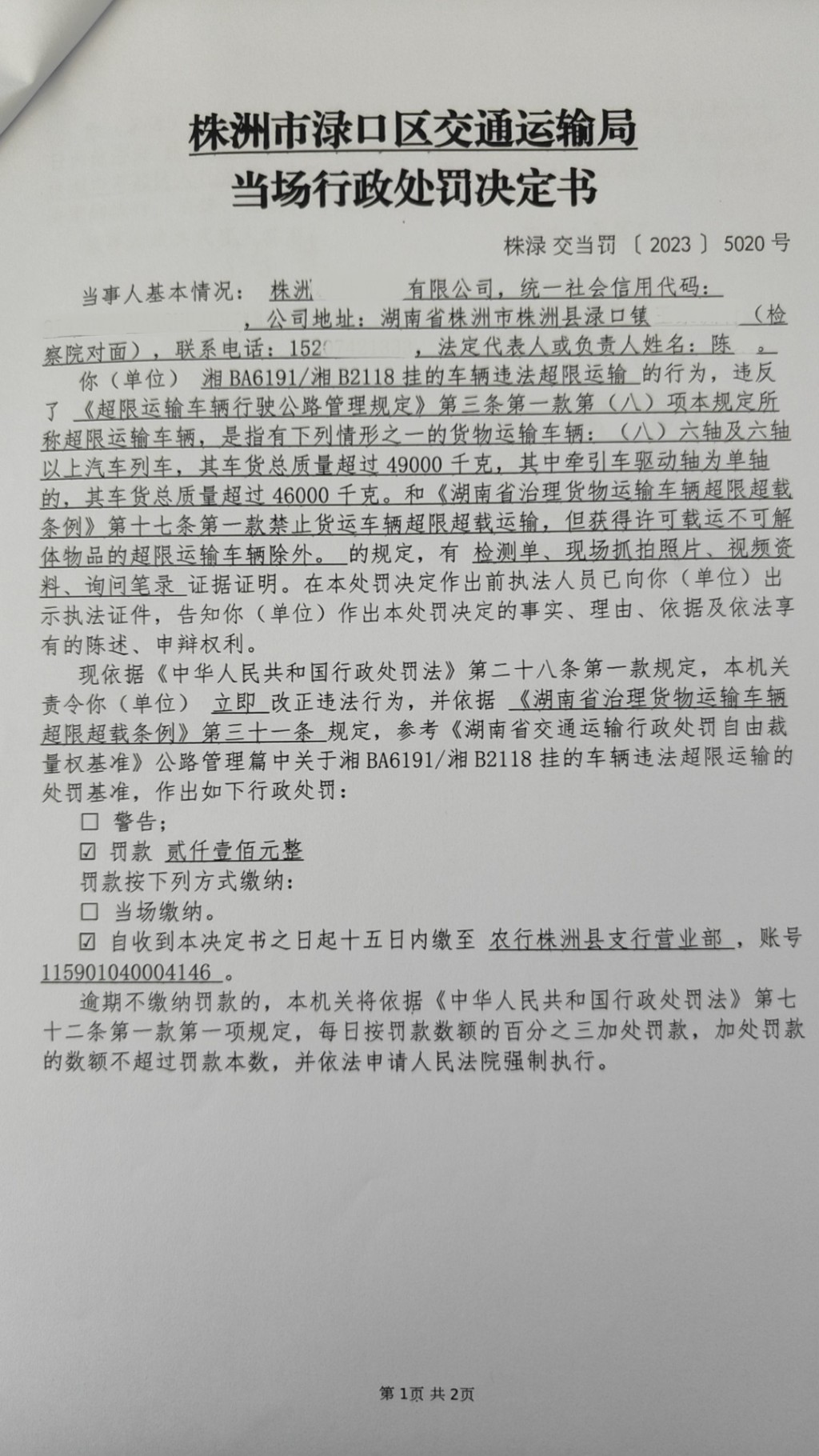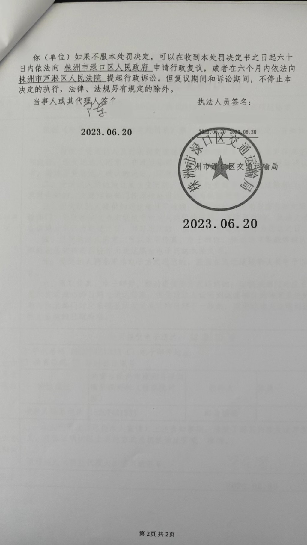 株洲市渌口区交通运输局当场行政处罚决定书株渌交当罚〔2023〕5020号