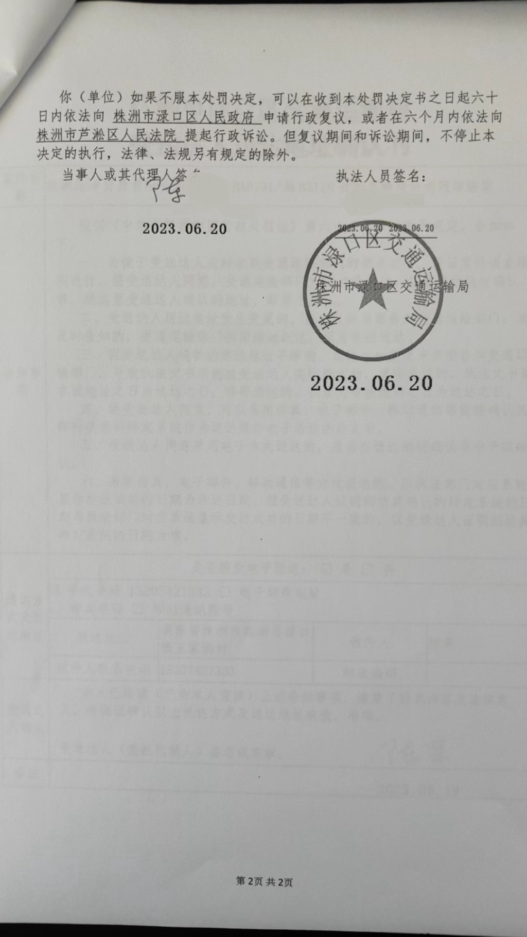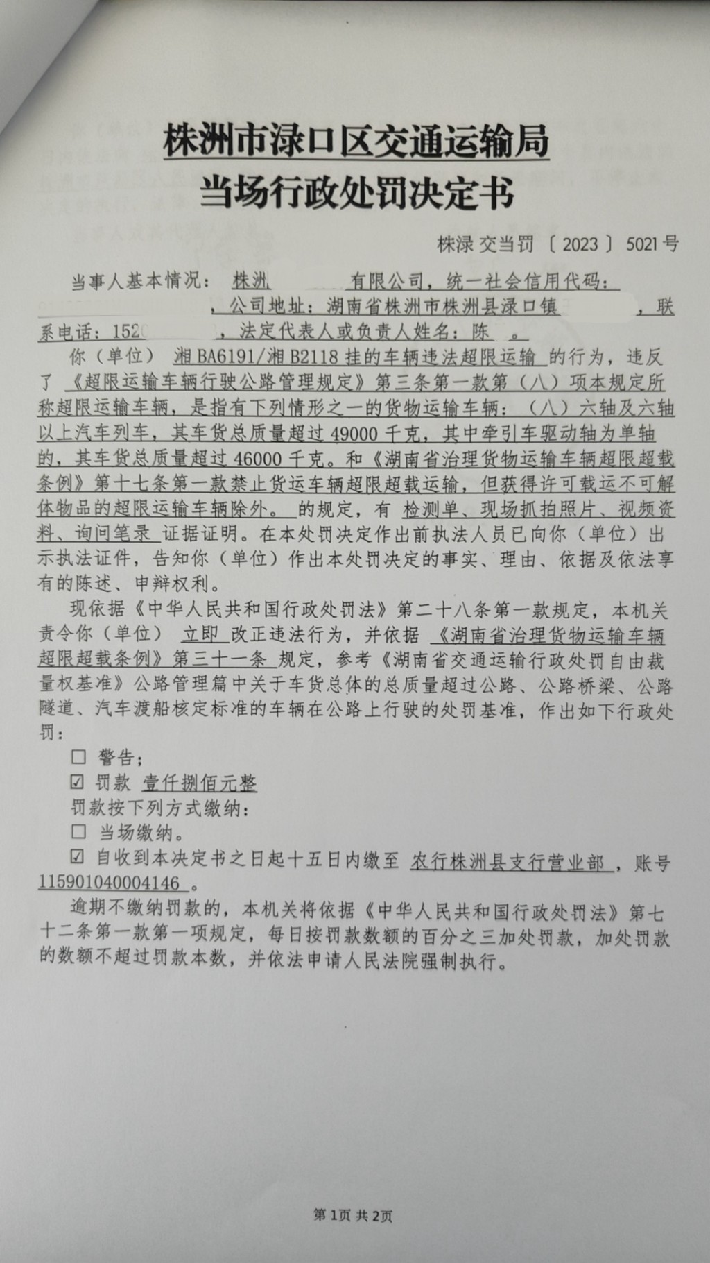 株洲市渌口区交通运输局当场行政处罚决定书株渌交当罚〔2023〕5021号