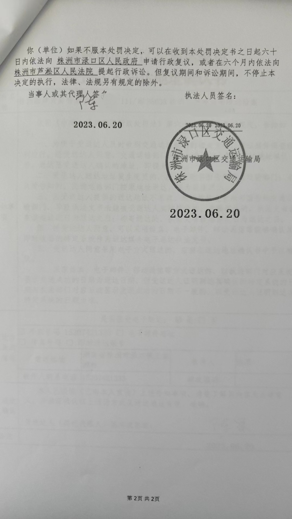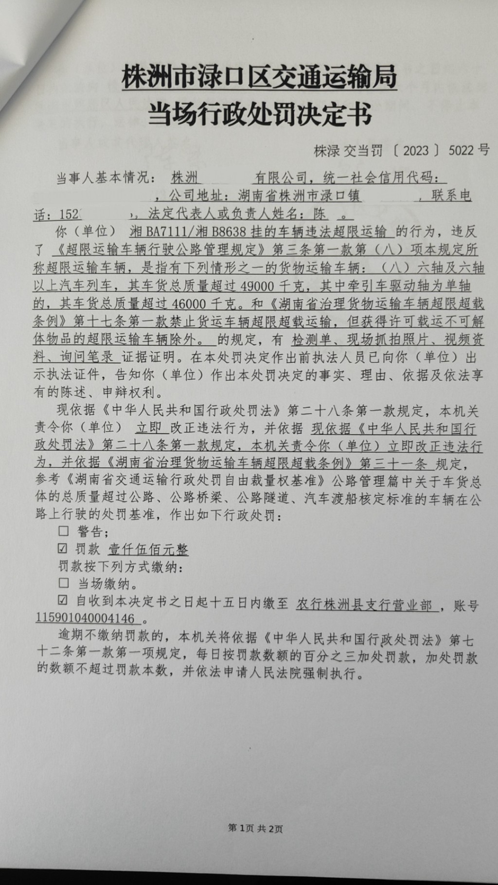 株洲市渌口区交通运输局当场行政处罚决定书株渌交当罚〔2023〕5022号
