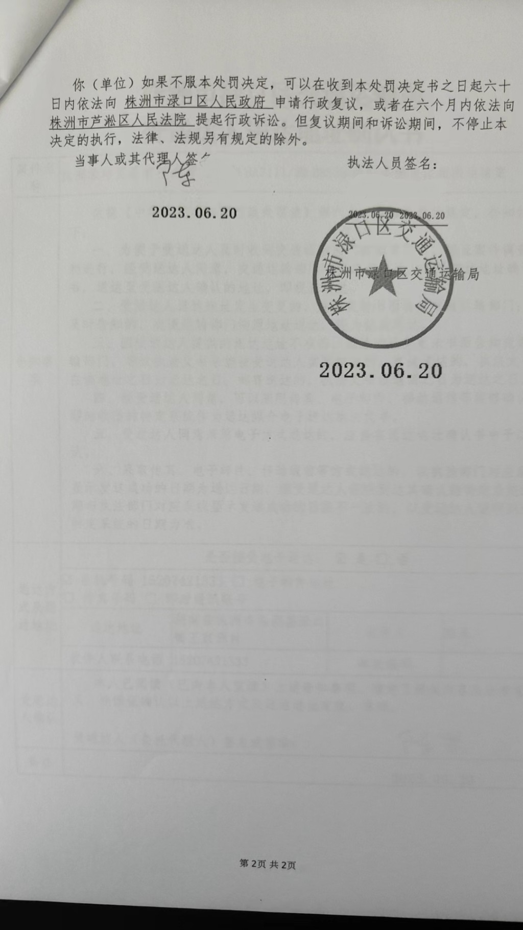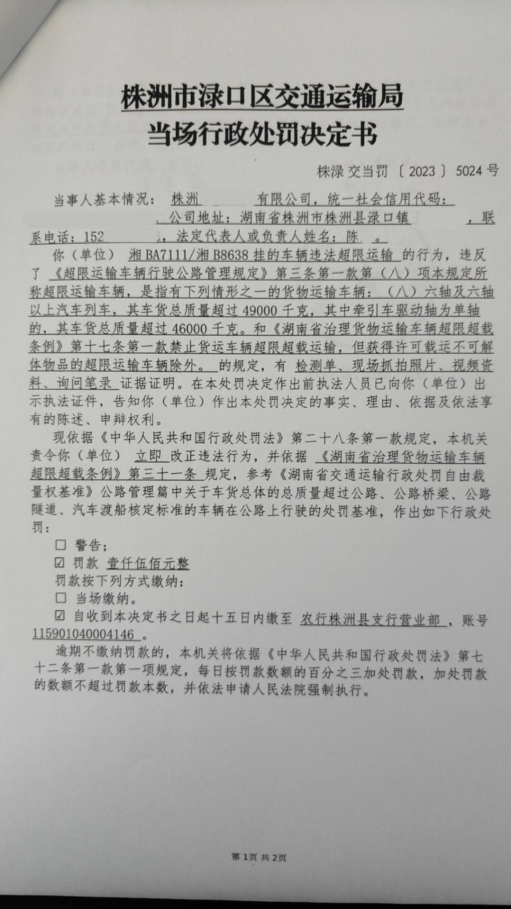 株洲市渌口区交通运输局当场行政处罚决定书株渌交当罚〔2023〕5024号