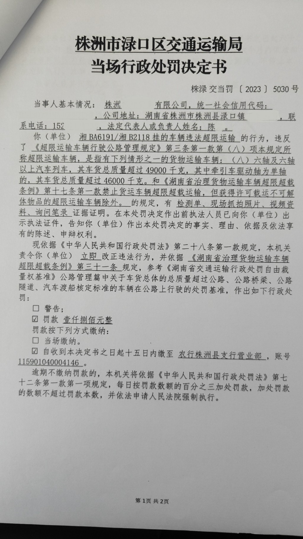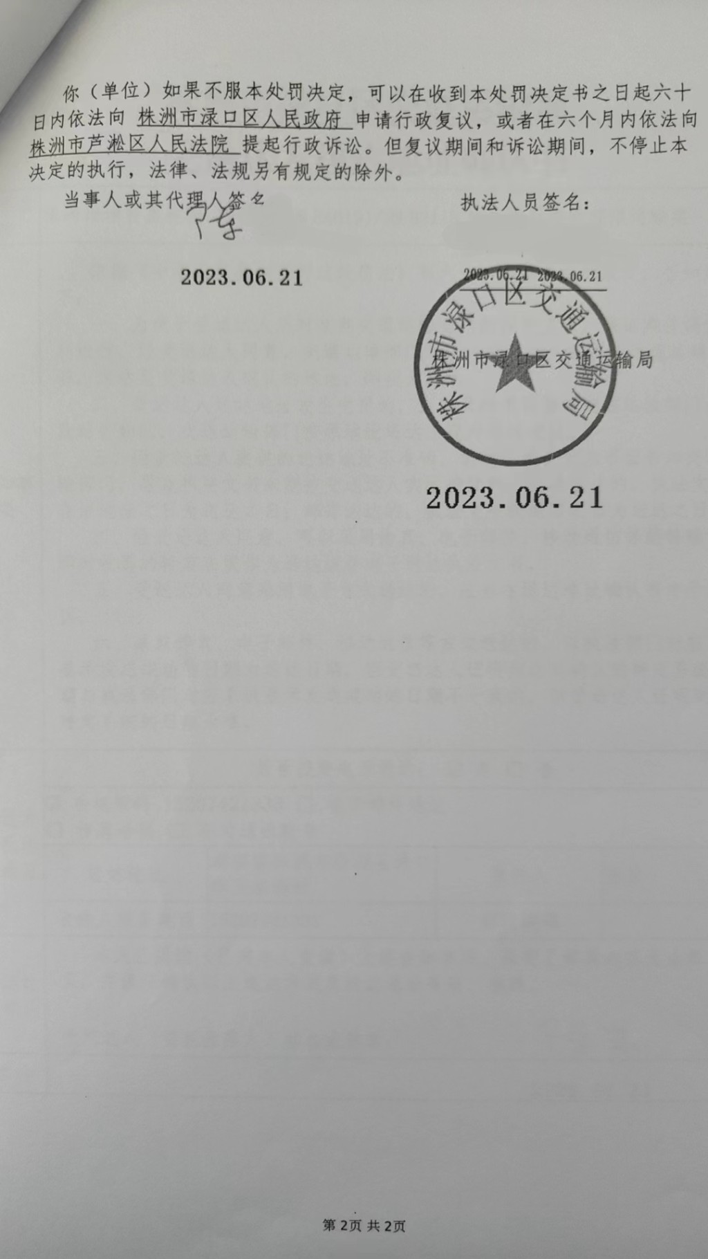 株洲市渌口区交通运输局当场行政处罚决定书株渌交当罚〔2023〕5030号