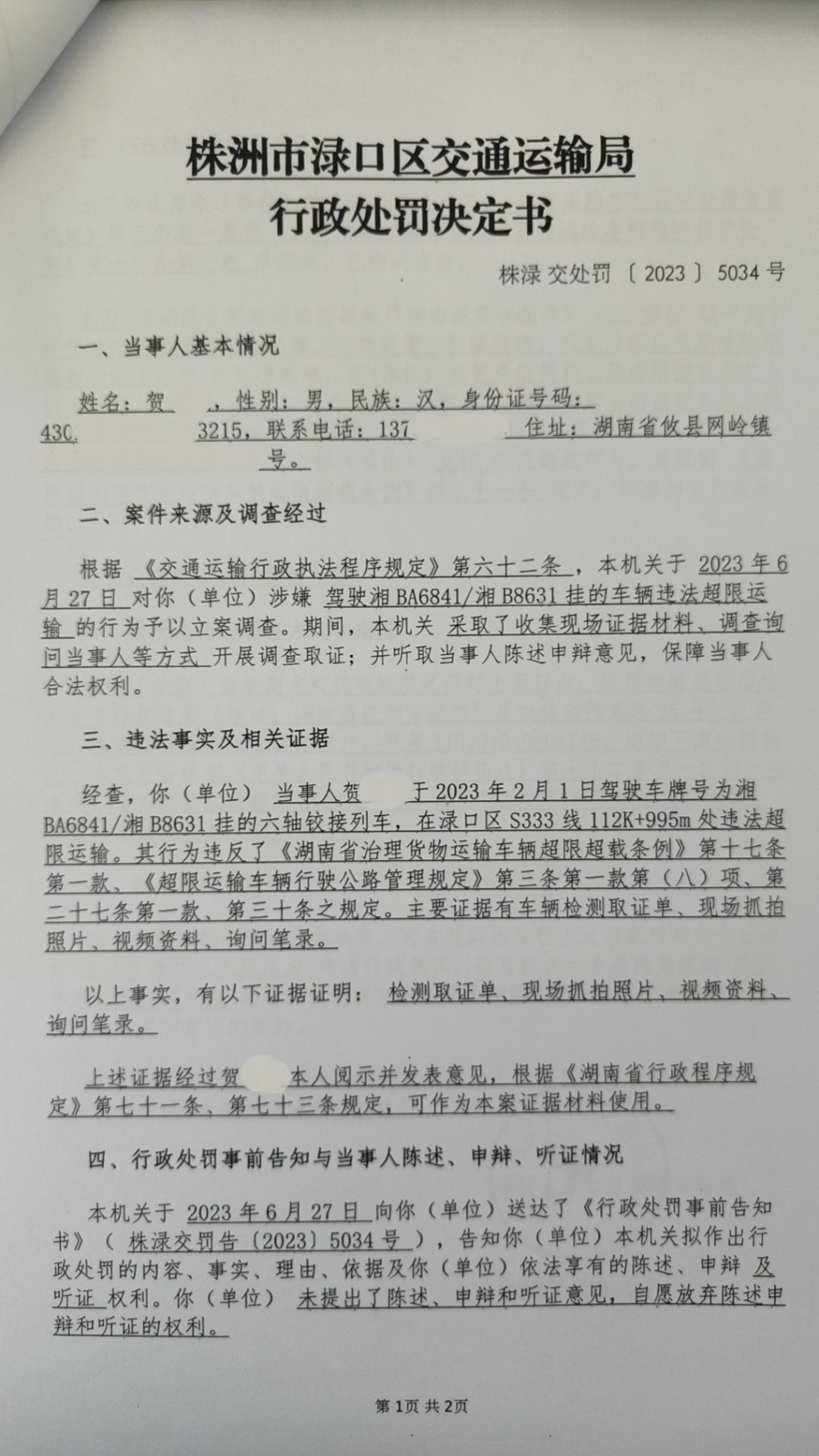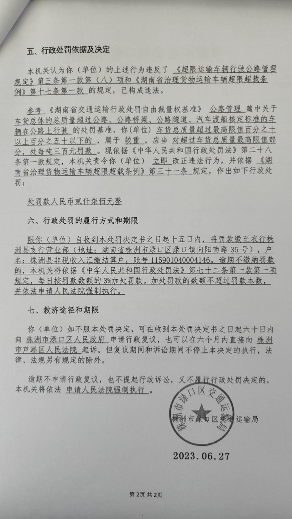 株洲市渌口区交通运输局行政处罚决定书株渌交处罚〔2023〕5034号