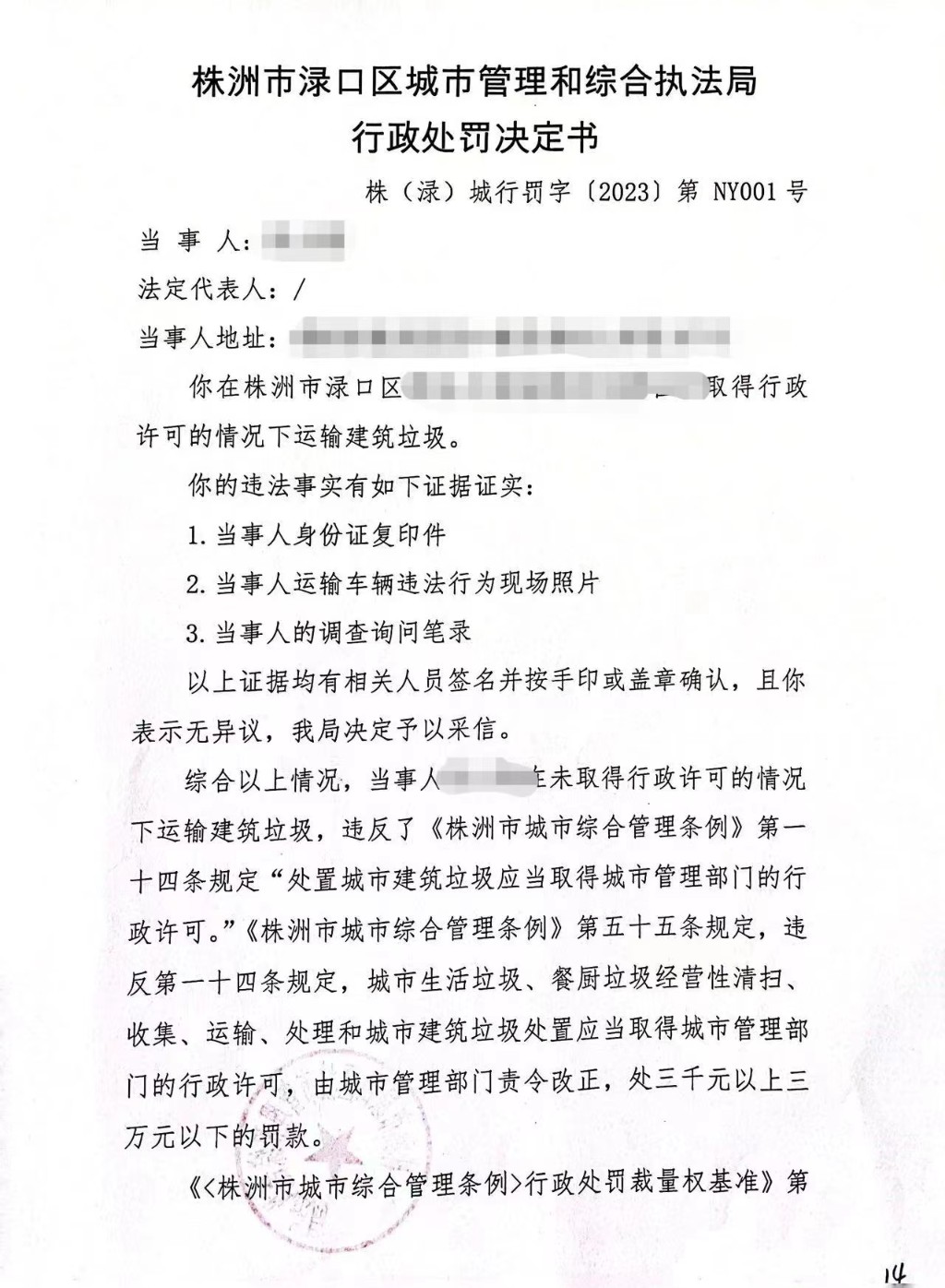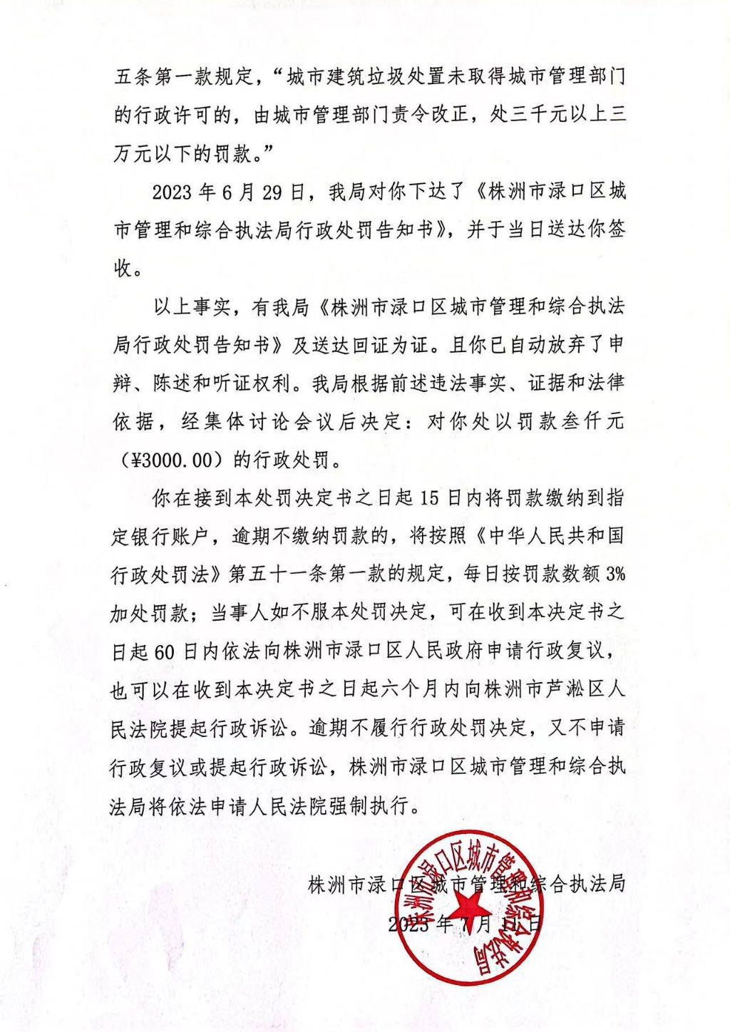 株洲市渌口区城市管理和综合执法局 行政处罚决定书 株(渌)城行罚字〔2023〕第 NY001号