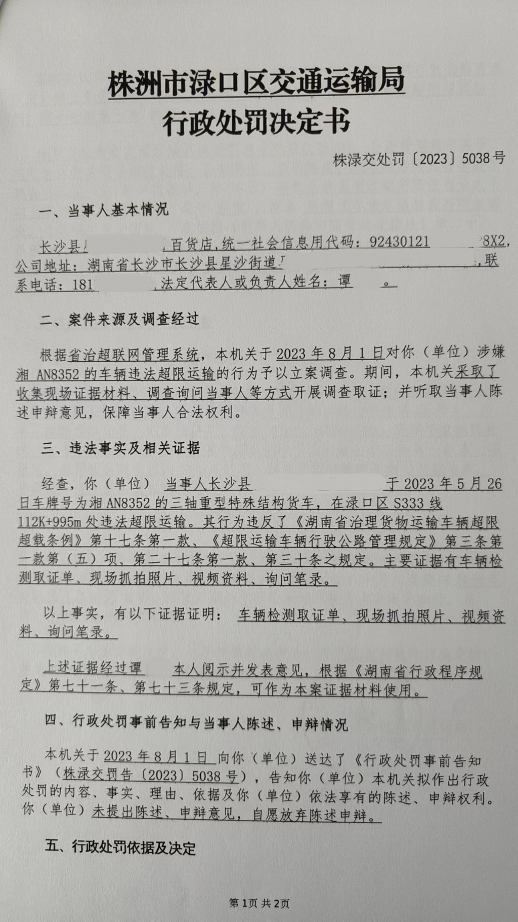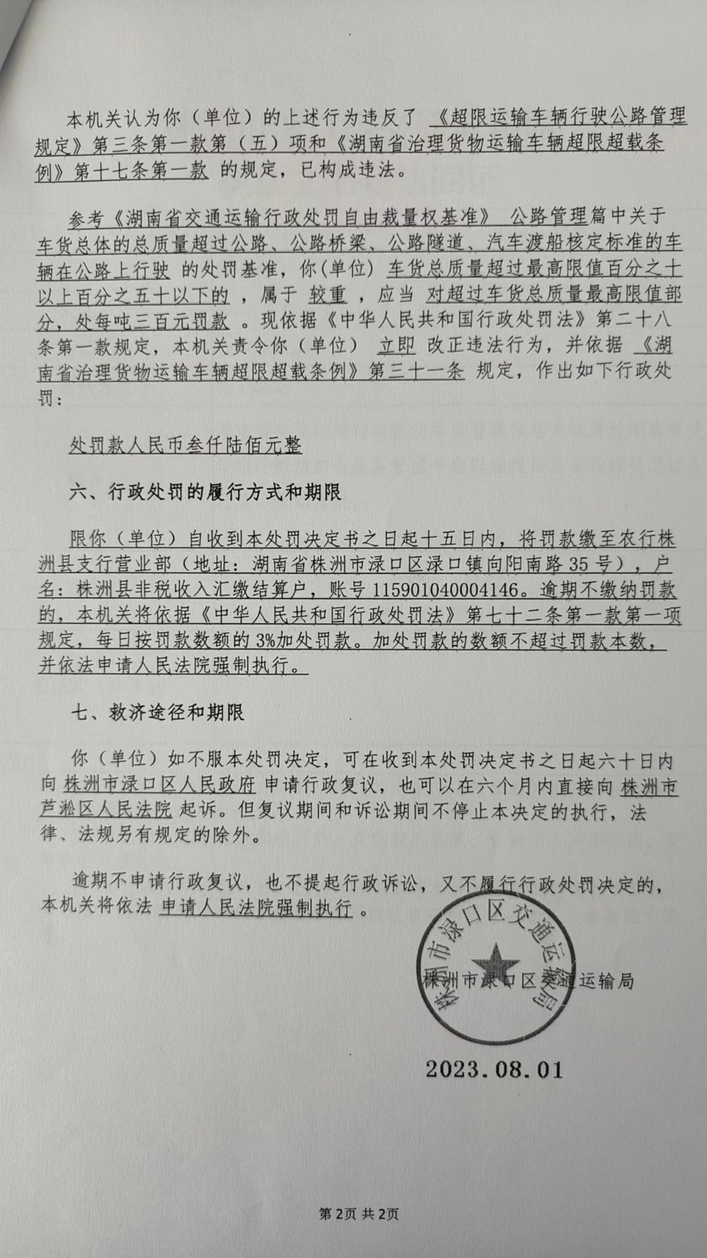 株洲市渌口区交通运输局行政处罚决定书株渌交处罚〔2023〕5038号