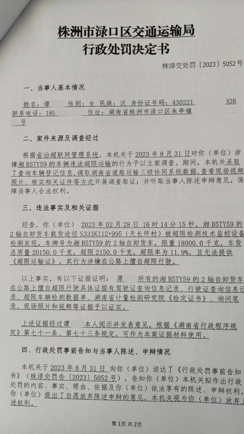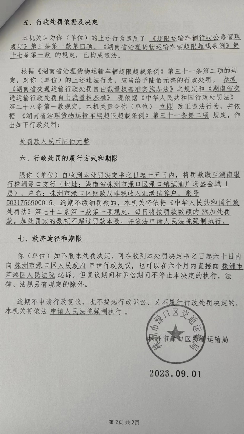 株洲市渌口区交通运输局行政处罚决定书株渌交处罚〔2023〕5052号
