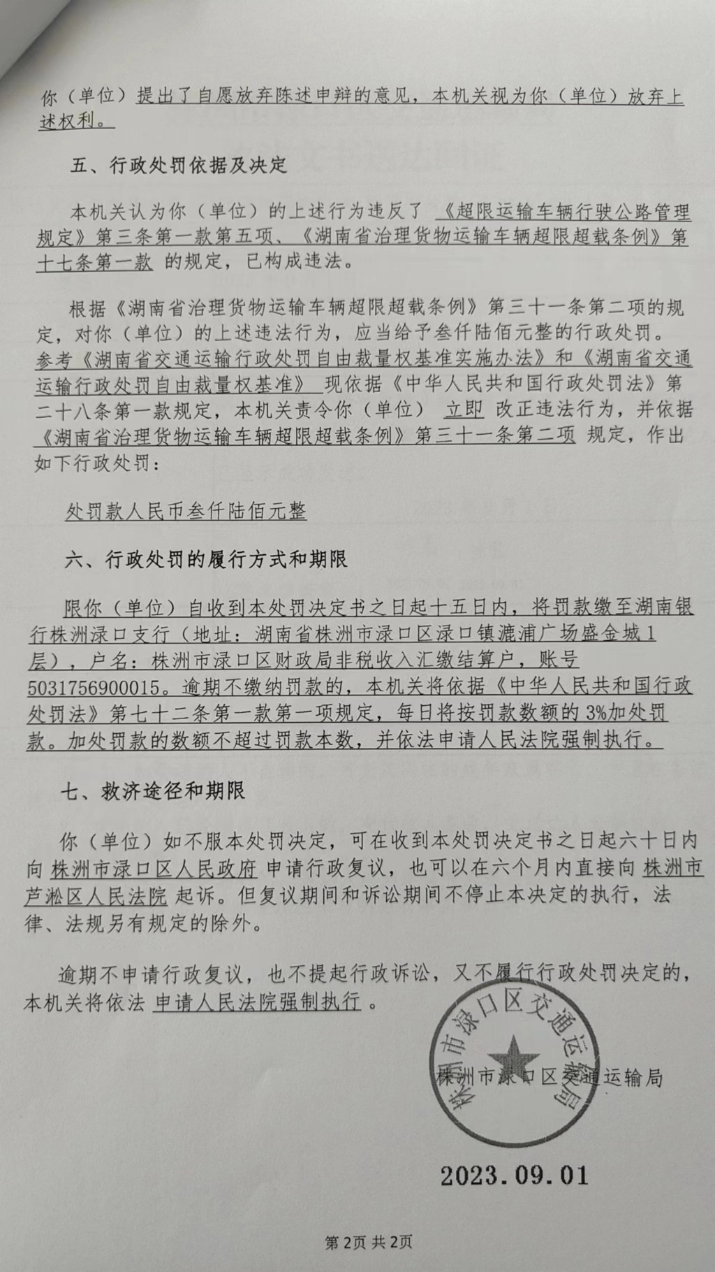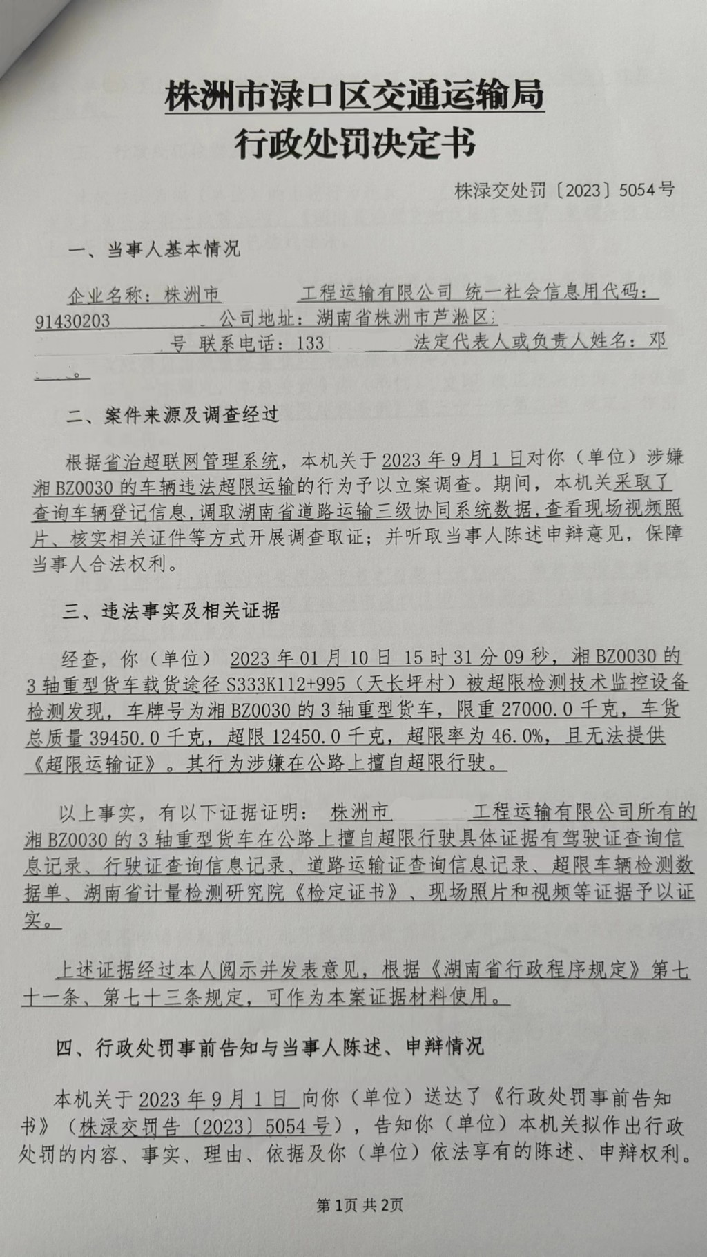 株洲市渌口区交通运输局行政处罚决定书株渌交处罚〔2023〕5054号