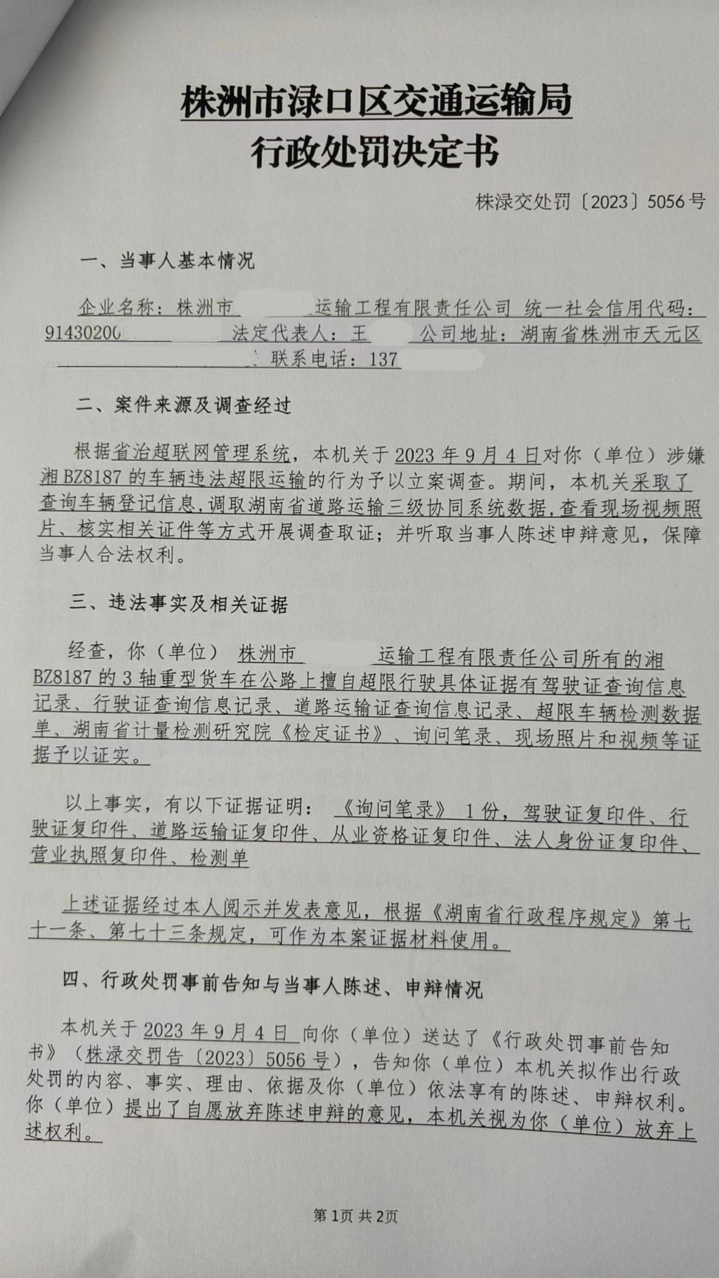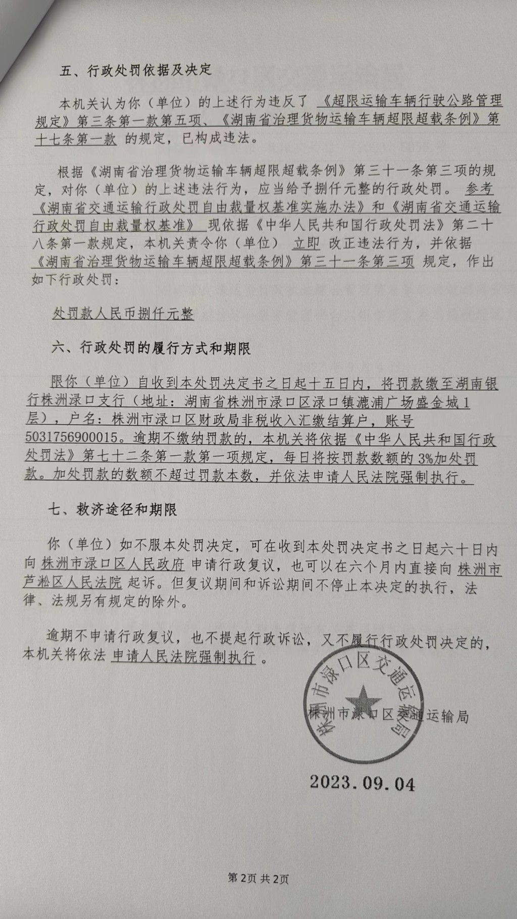 株洲市渌口区交通运输局行政处罚决定书株渌交处罚〔2023〕5056号