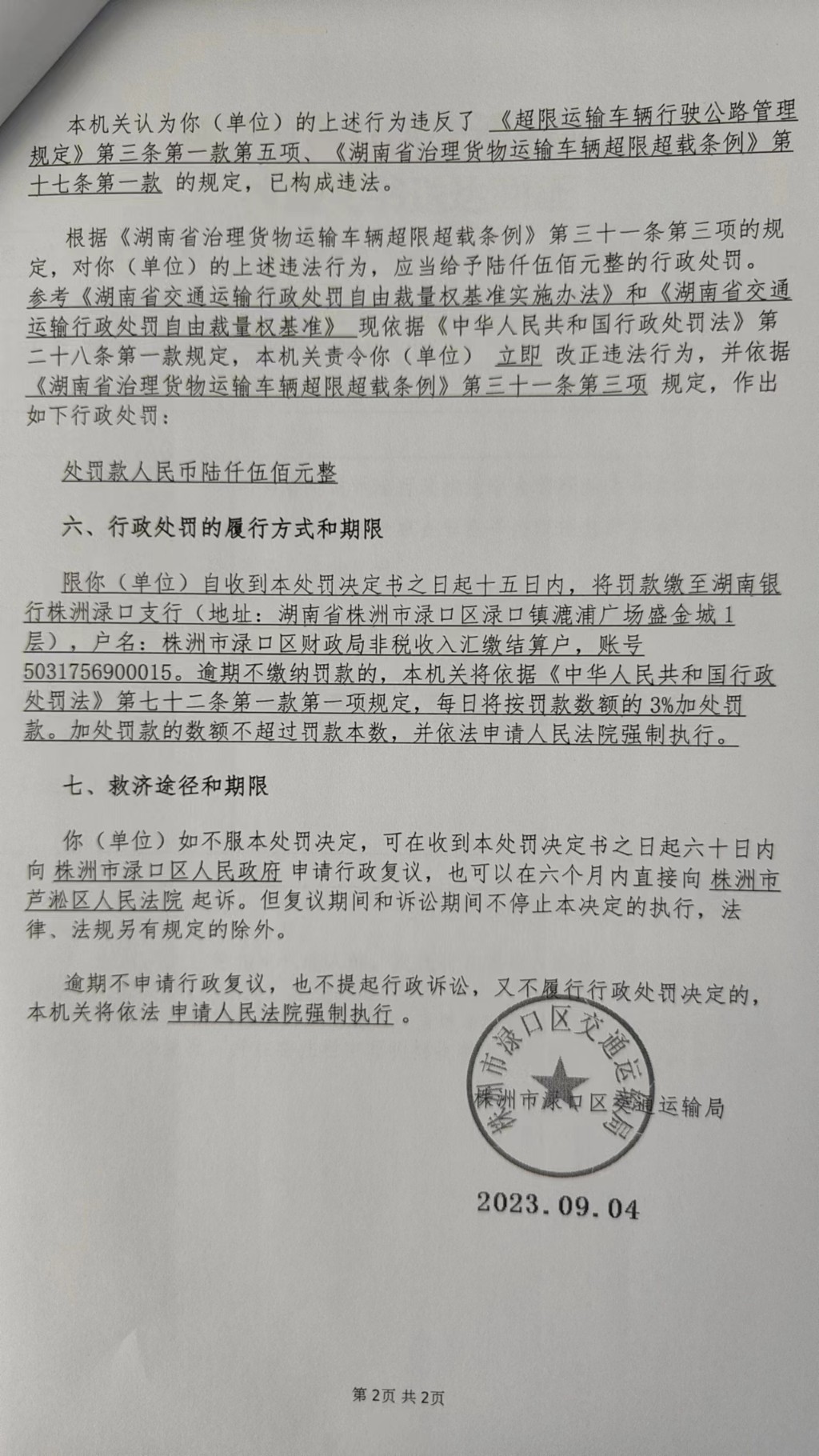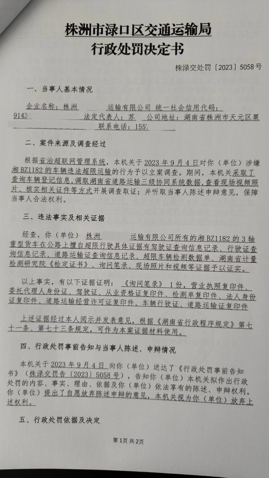 株洲市渌口区交通运输局行政处罚决定书株渌交处罚〔2023〕5058号