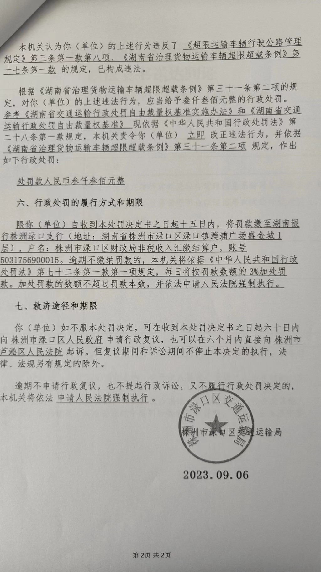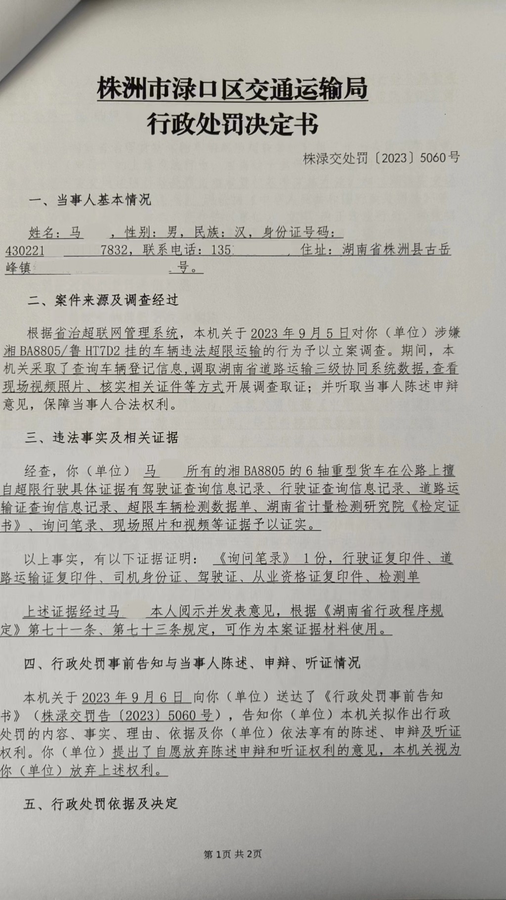 株洲市渌口区交通运输局行政处罚决定书株渌交处罚〔2023〕5060号