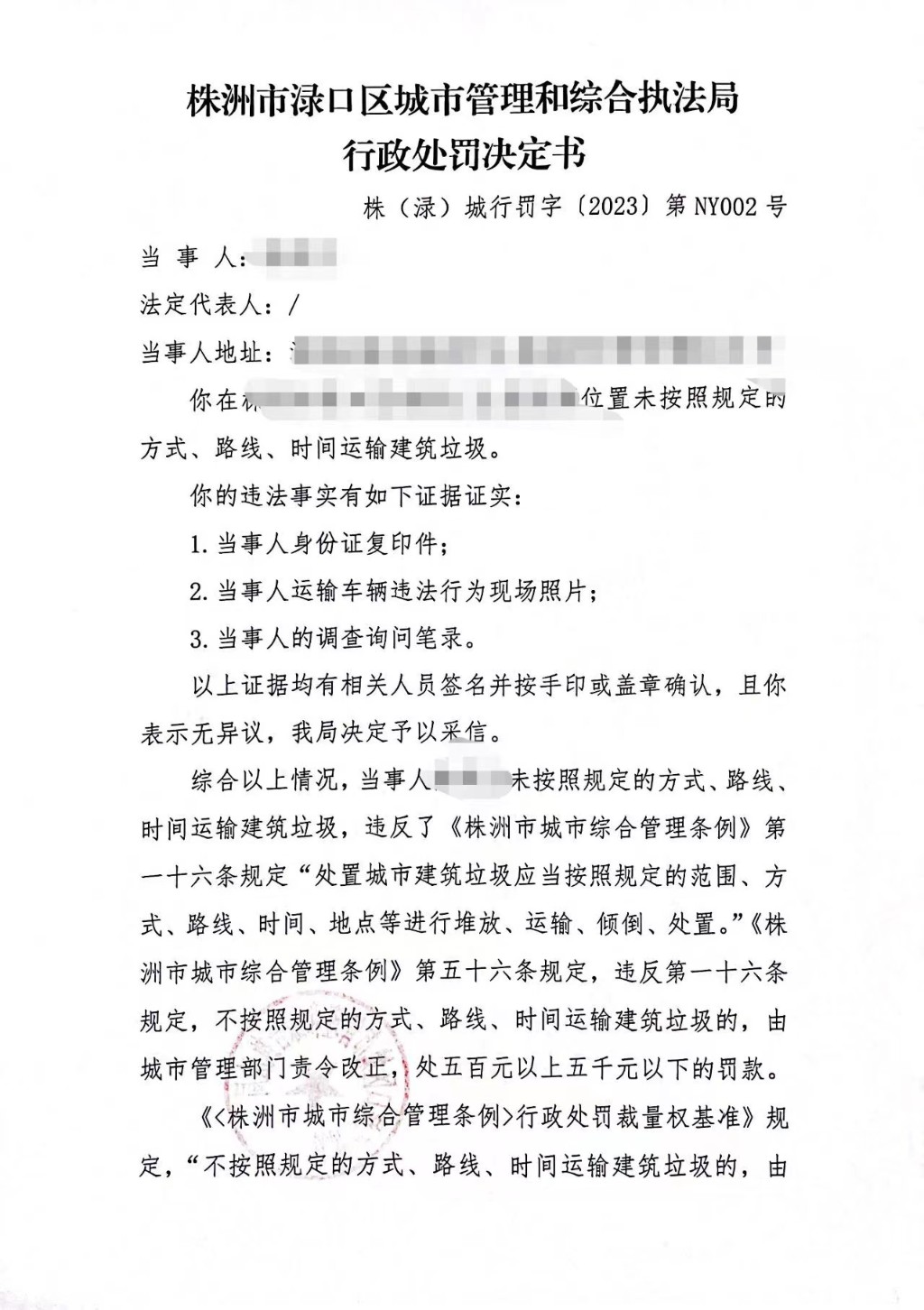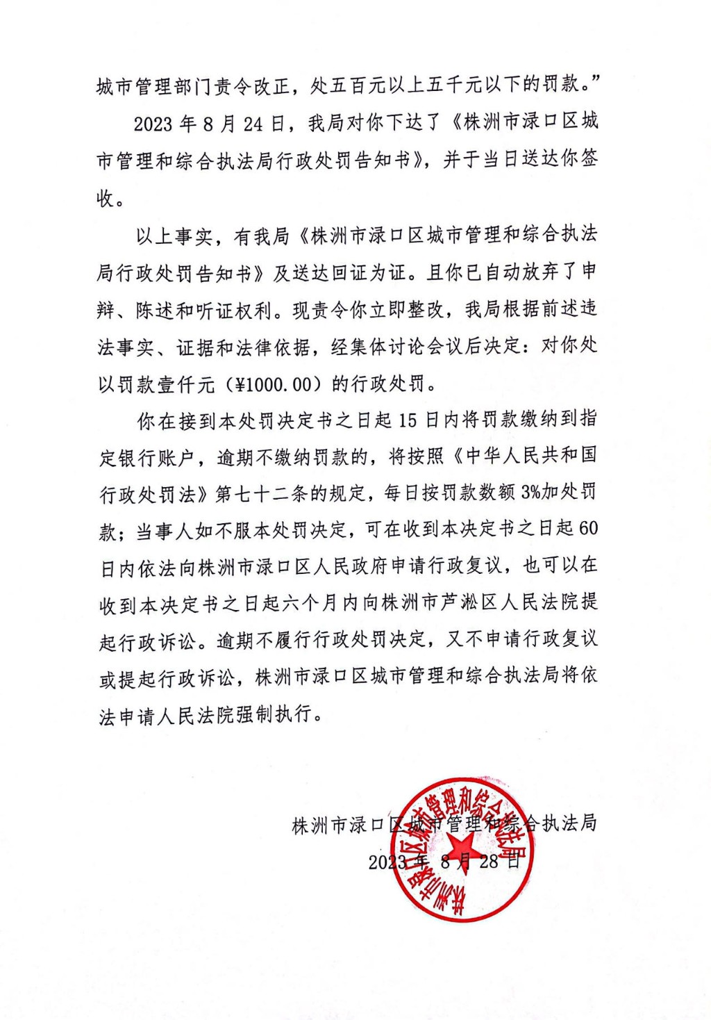 株洲市渌口区城市管理和综合执法局行政处罚决定书 株(渌)城行罚字〔2023〕第NY002号