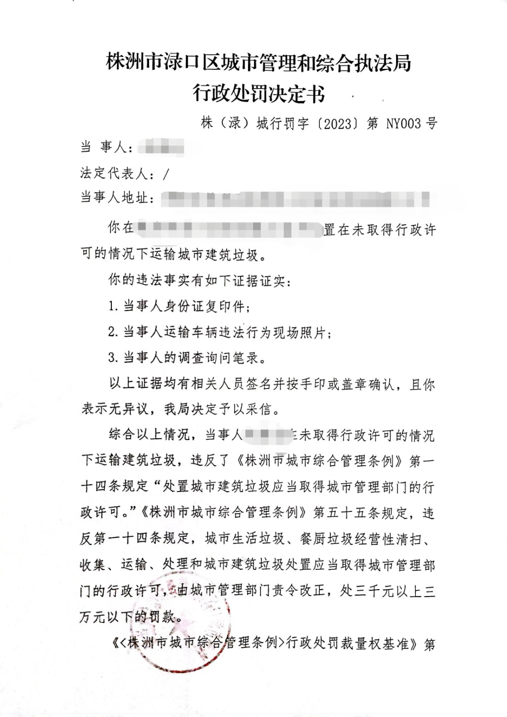 株洲市渌口区城市管理和综合执法局行政处罚决定书 株(渌)城行罚字〔2023〕第NY003号