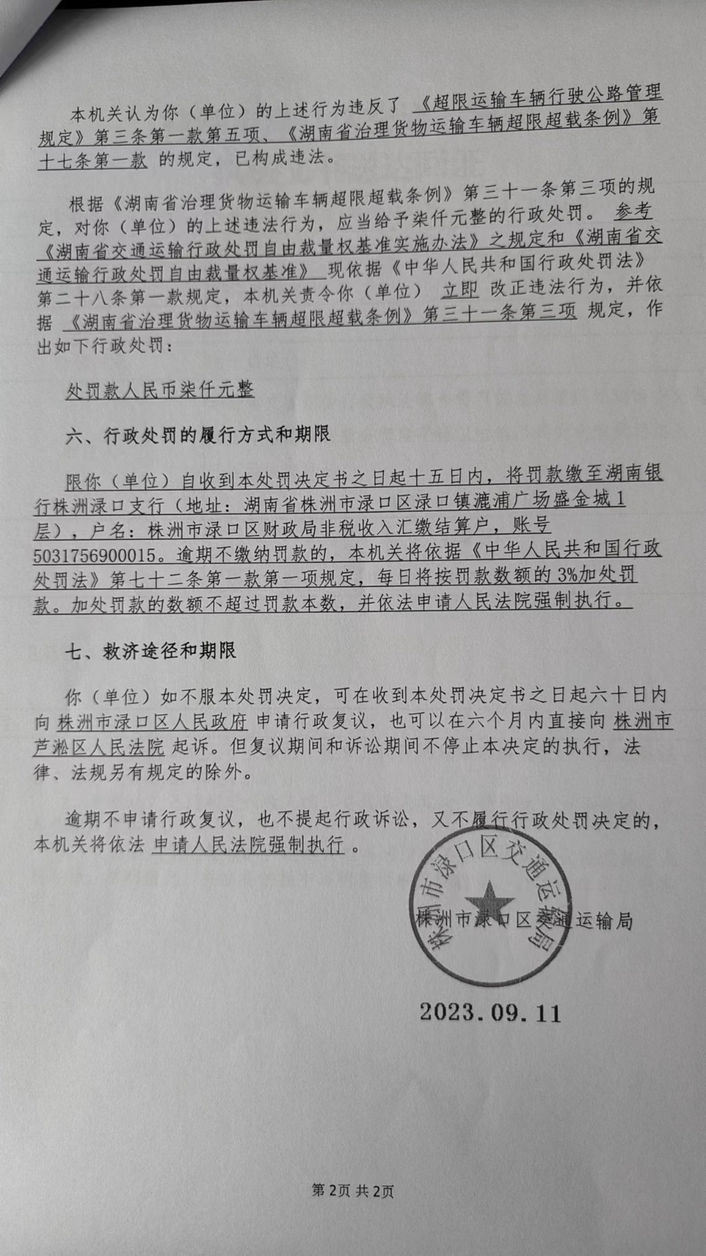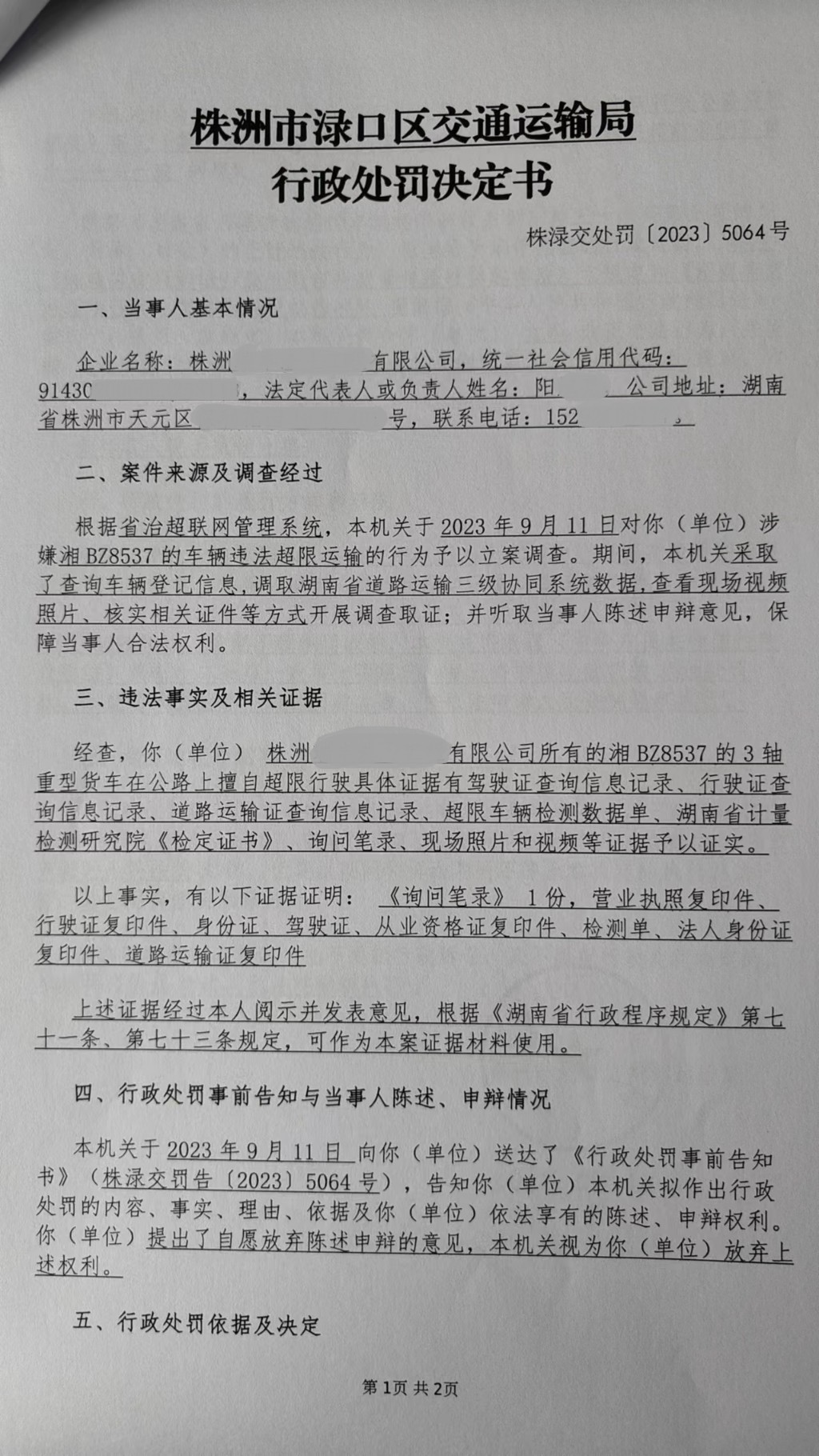 株洲市渌口区交通运输局行政处罚决定书株渌交处罚〔2023〕5064号